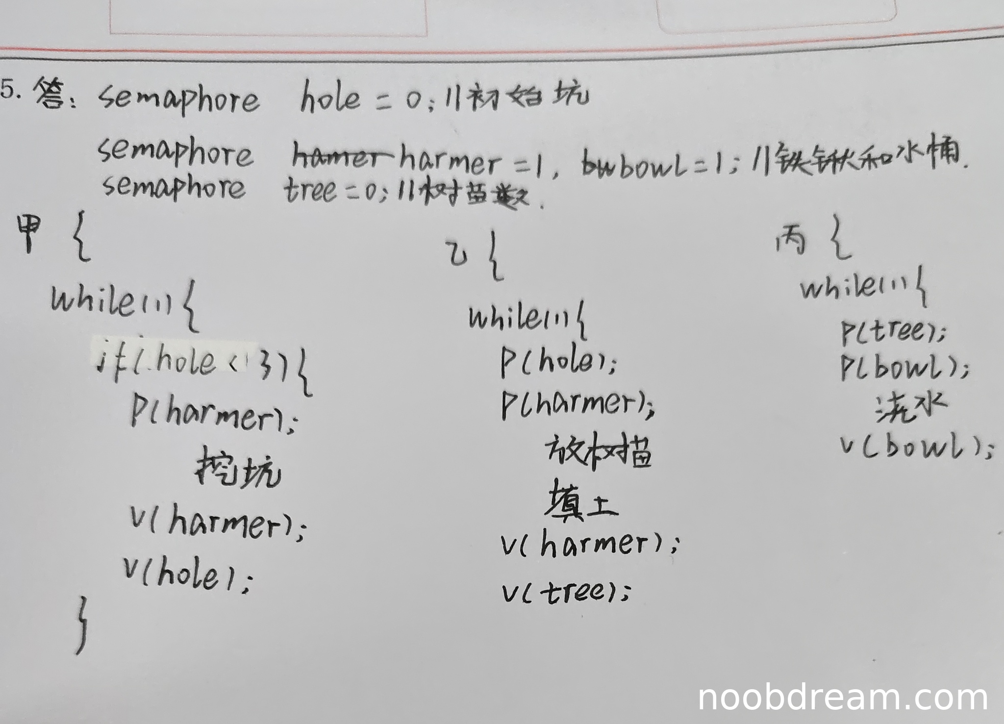 理由:丙的代码逻辑正确,P(tree)等待树苗准备好,P(bowl)互斥使用水桶,浇水后V(bowl)释放水桶。