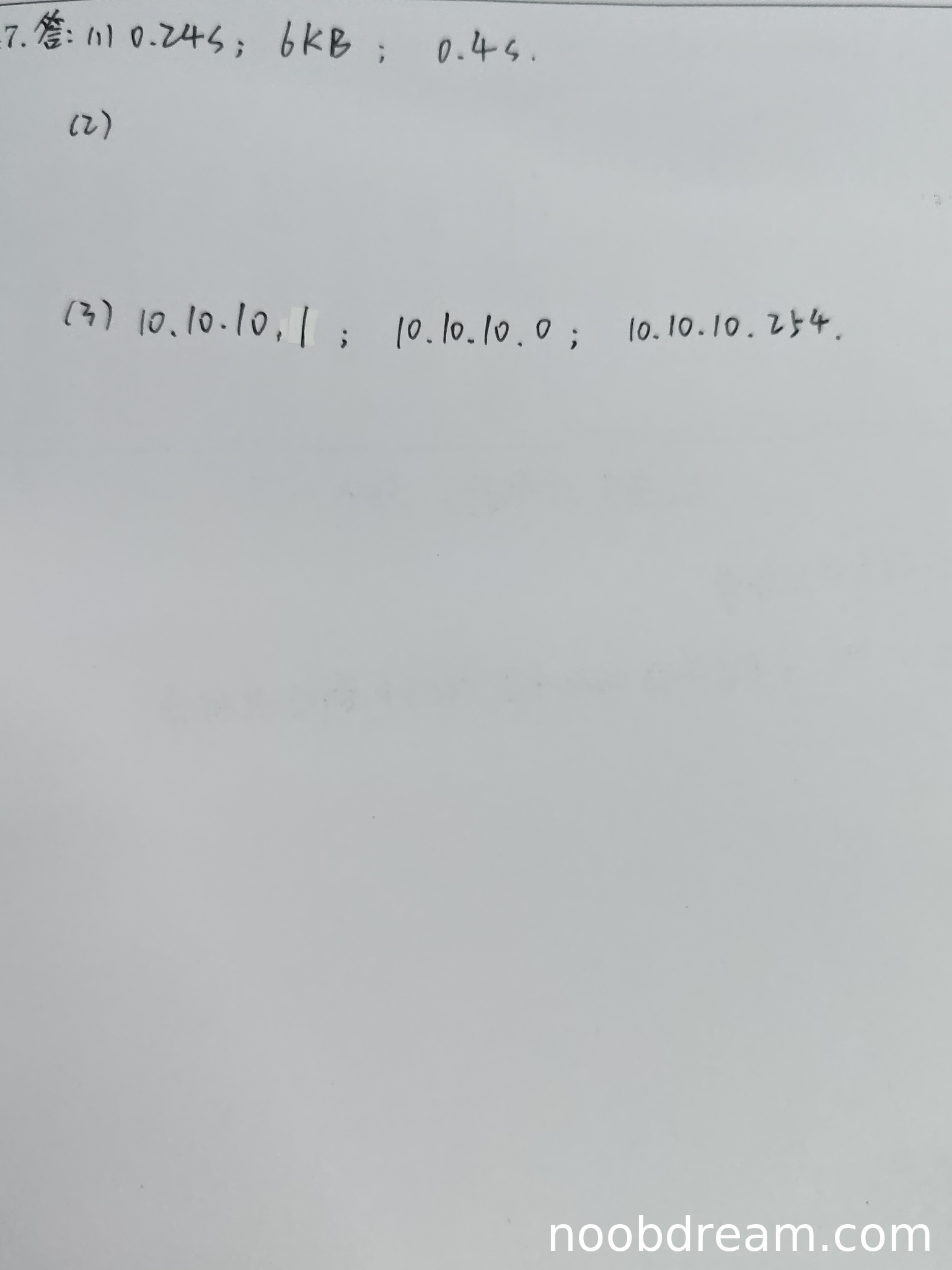 学生给出的三个IP地址(10.10.10.1、10.10.10.0、10.10.10.254)均不符合CIDR子网划分要求,既未体现子网掩码,也未正确划分子网范围,完全错误,得0分。