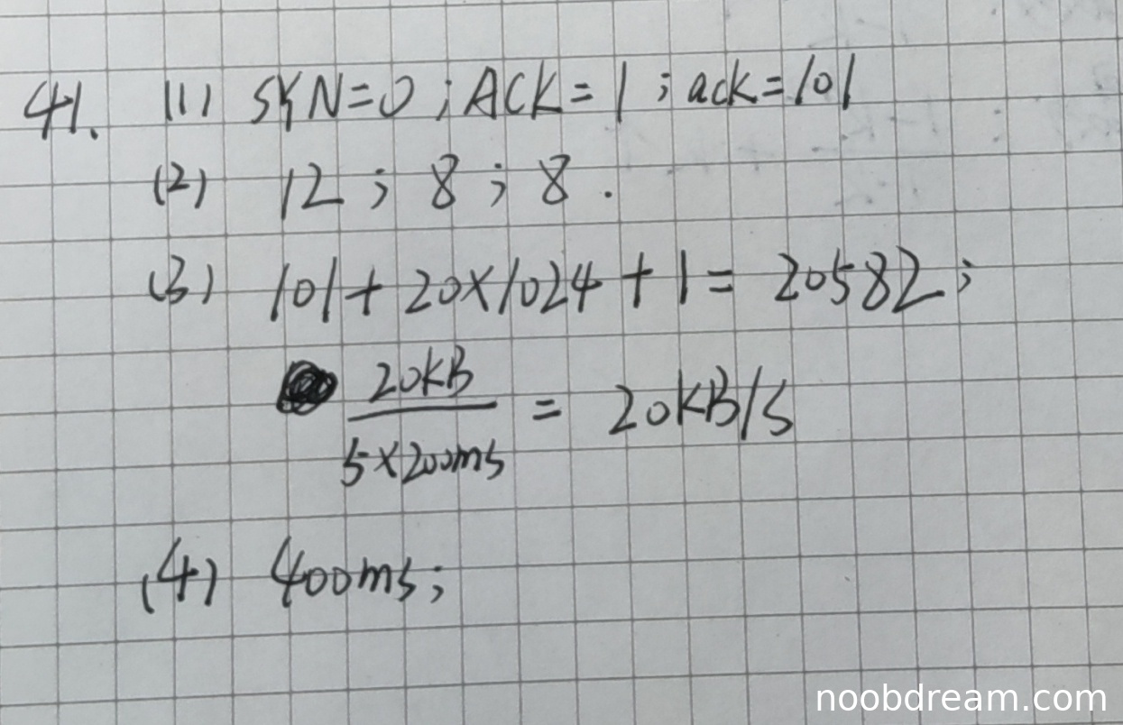 学生计算的下一个待发送段序号20582错误(标准答案20581),但计算思路基本正确,只是起始序号理解有偏差。数据传输速率20KB/s错误(标准答案20.48kbps),单位换算和计算过程都有错误。两个部分都有错误,各扣1分。得0分。