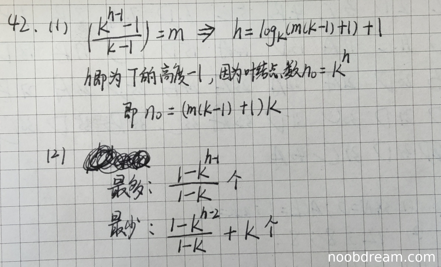 学生作答中,对于第(1)问,首先给出了关系式 \(\frac{k^{h-1}-1}{k-1} = m\),然后推导出 \(h = \log_k(m(k-1)+1) + 1\),并指出 \(h\) 是树的高度减1,最后得到叶结点数 \(n_0 = (m(k-1)+1)k\)。这个结果与标准答案 \(n_0 = (k-1)m + 1\) 不一致,且推导过程中存在逻辑错误:学生错误地将 \(h\) 理解为高度减1,并错误地使用 \(n_0 = k^h\),导致最终表达式错误。因此,该部分答案不正确。但考虑到学生尝试使用高度和层数关系进行推导,有一定思路,但核心逻辑错误,扣分较多。得分:1分(部分思路分)。