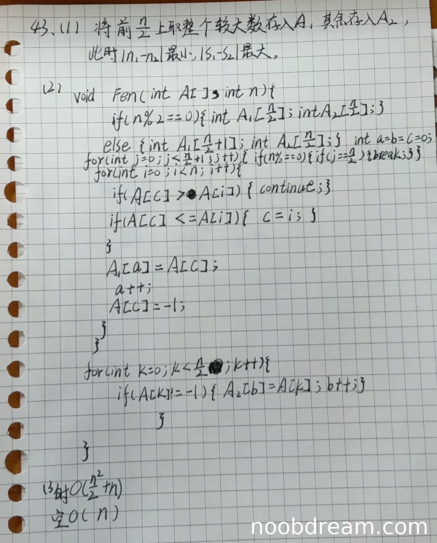 理由:学生答案中提出"将前n/2上取整个较大数存入A1,其余存入A2",这个基本思路是正确的,因为确实需要将较大的n/2个元素放在一个子集中,较小的n/2个元素放在另一个子集中,这样才能使|S1-S2|最大且|n1-n2|最小。但是学生没有给出具体的实现思想,特别是没有提到如何高效地找到这n/2个较大元素,只是简单描述结果,没有算法设计思想,因此扣2分。