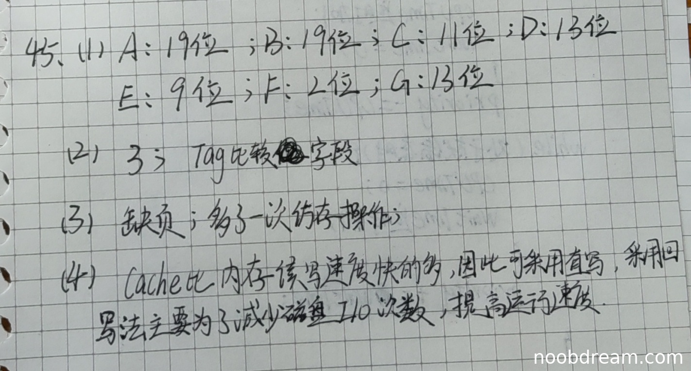 学生答案中,Cache组号计算正确(3),得1分。H字段内容应为块号的高位(Tag),学生答为“Tag比较字段”,表述不准确,但意思接近,得1分。因此,本小题得分为2分。