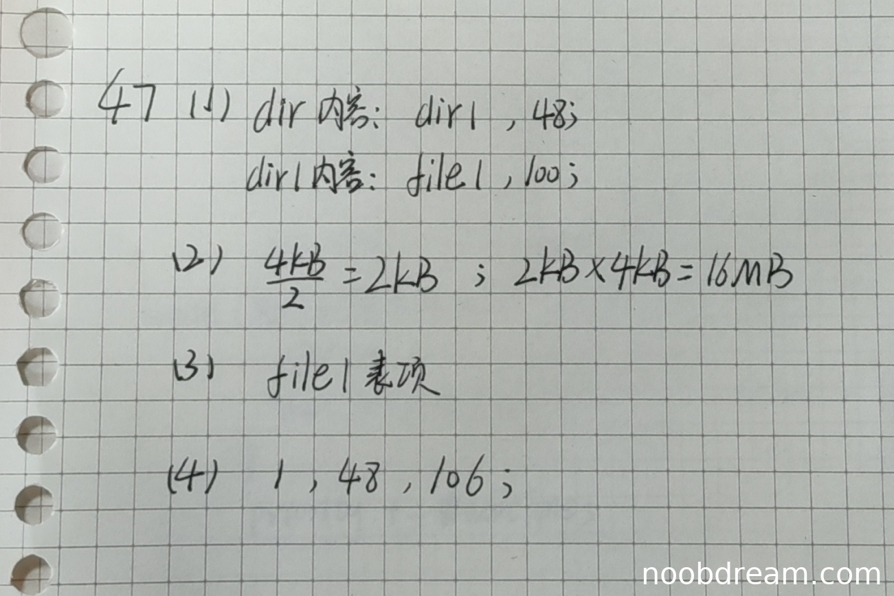 学生答案中给出了dir目录文件的内容为(dir1, 48),正确;但dir1目录文件的内容只给出了(file1, 100),缺少(file2, 200)。根据标准答案,dir1目录文件应包含file1和file2两个目录项。因此扣1分,得2分。