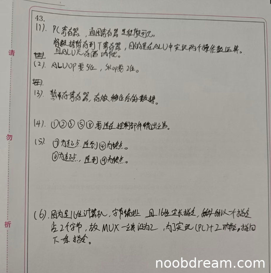 学生正确解释了由于16位指令按字节编址占2个单元,MUX一端设为2是为了实现(PC)+2操作。理由完整正确。因此得2分。