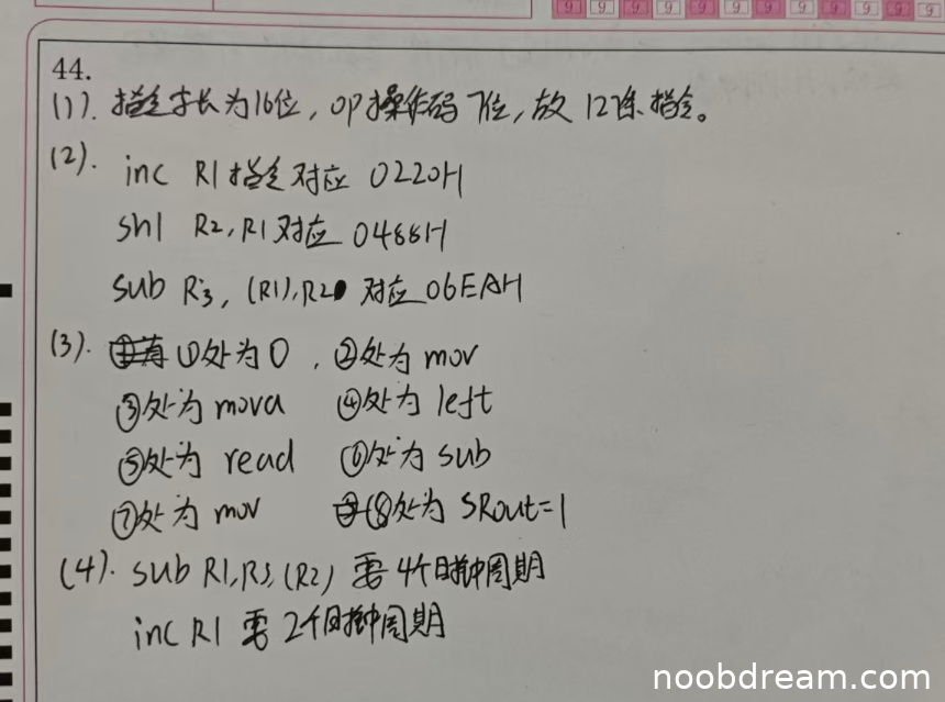 学生两次识别对“inc R1”回答均为0220H(标准答案0240H),“shl R2,R1”第一次为04681H(错误,超出16位)、第二次为0468H(标准答案0488H),“sub R3,(R1),R2”两次均为06EAH(正确)。三个指令中两个错误,但“shl”第二次识别可能为误写(0468H与0488H相似),根据误写不扣分原则,仅“inc”明确错误。每个指令1分,扣1分,得2分。
