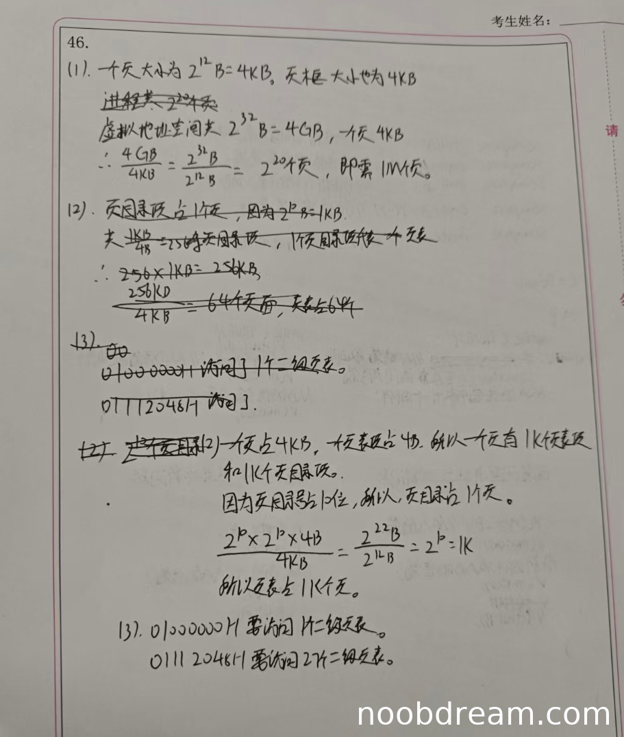 学生正确计算出页和页框大小为4KB(2^12B),并正确得出虚拟地址空间大小为2^20页。两次识别结果均正确,得2分。