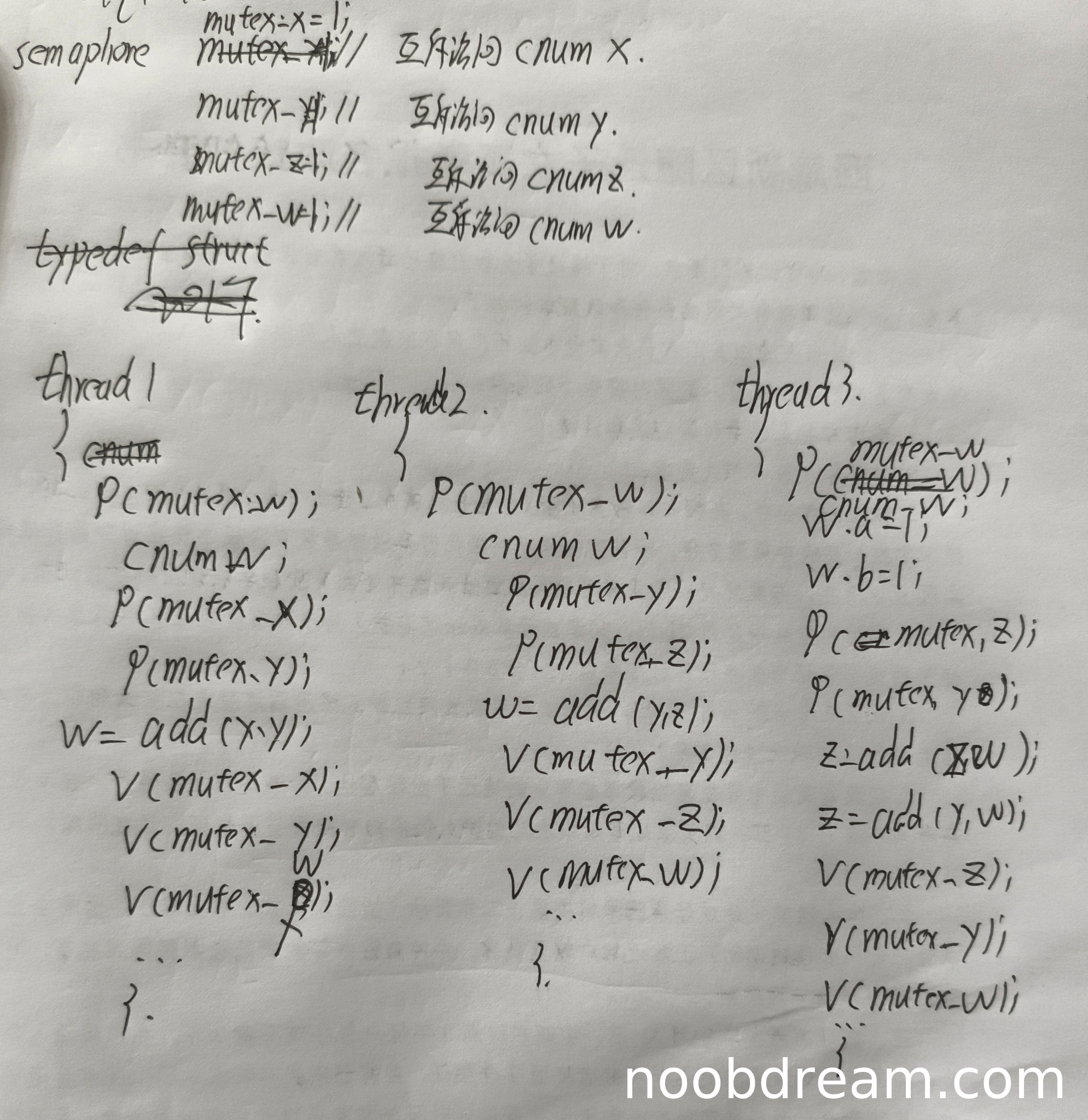 学生定义了4个信号量:mutex_x、mutex_y、mutex_z、mutex_w。其中mutex_x、mutex_y、mutex_z的定义是合理的,分别保护x、y、z变量。但mutex_w的定义不合理,因为每个线程中的w都是局部变量,不需要互斥保护。信号量定义部分得2分(扣1分)。