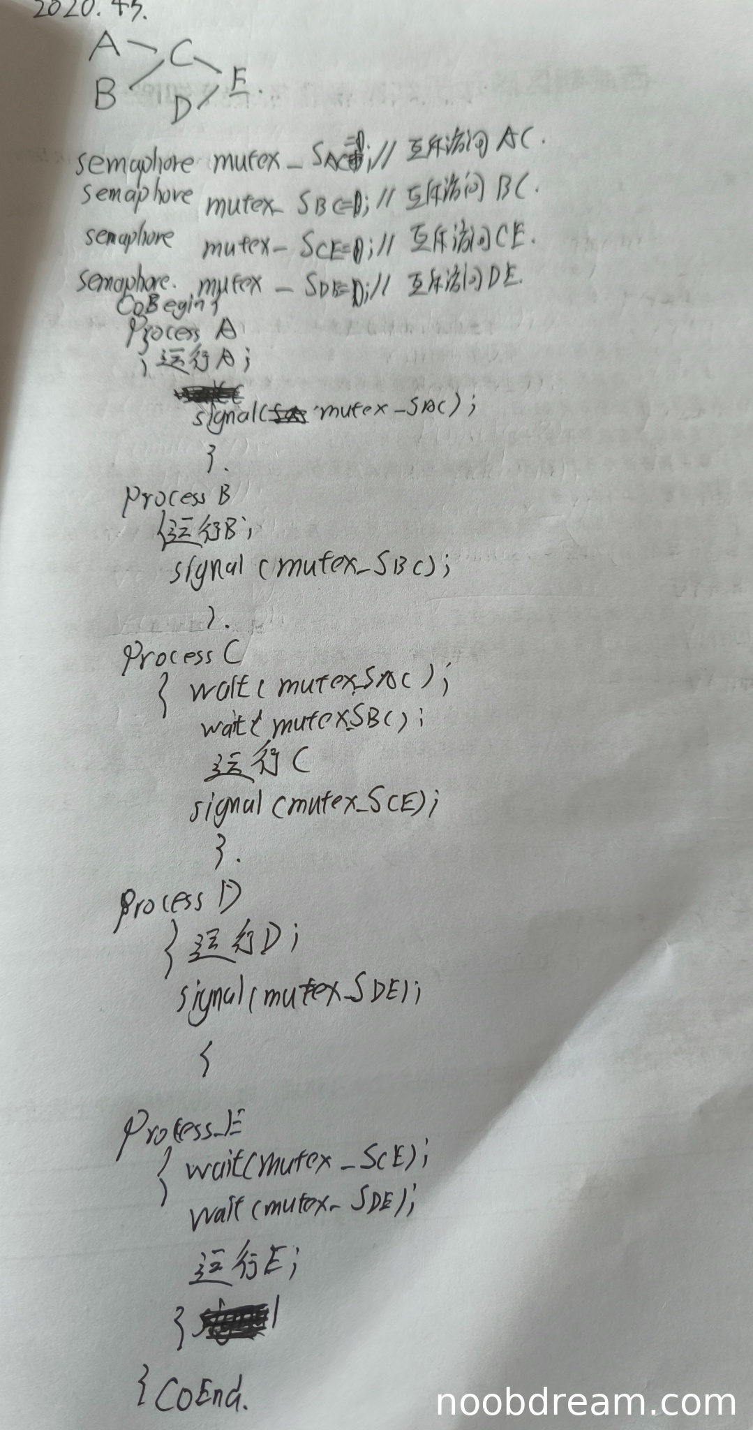 - 操作E需要等待C和D完成,学生使用了wait(mutex_SCE)和wait(mutex_SDE),正确。