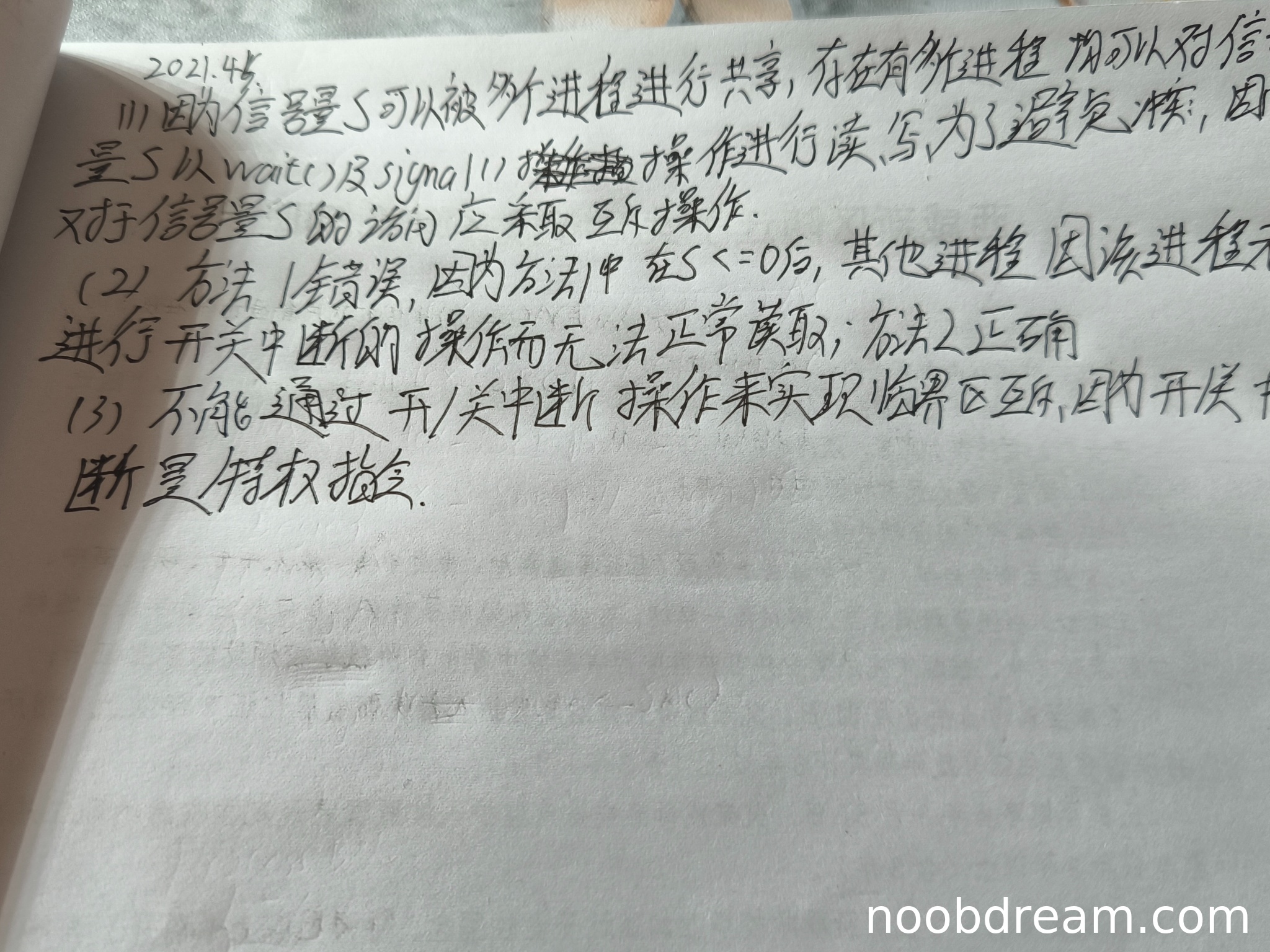 学生正确判断方法1错误、方法2正确。对于方法1的错误原因,学生提到“其他进程因该进程进行开关中断的操作而无法正常获取”,虽然表述不如标准答案“while语句陷入死循环”精确,但基本指出了问题本质(其他进程无法修改S导致无法退出循环)。对于方法2正确性的理由虽然未详细说明,但判断正确。扣1分,因为对方法1错误原因的分析不够准确和完整。得2分。