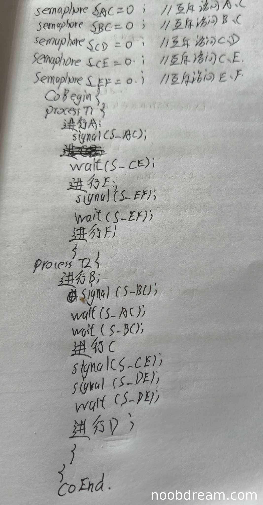 理由:T2线程中B操作后signal(S_BC),C操作前wait(S_AC)和wait(S_BC),C操作后signal(S_CE)和signal(S_CD),D操作前wait(S_CD),这些同步操作基本正确。但标准答案中只需要跨线程同步,而学生答案包含了线程内部的同步关系(如S_BC、S_CD、S_EF),虽然多余但不影响正确性。考虑到题目要求描述T1和T2之间的同步关系,学生答案虽然包含了不必要的信号量,但核心逻辑正确,扣0.5分。