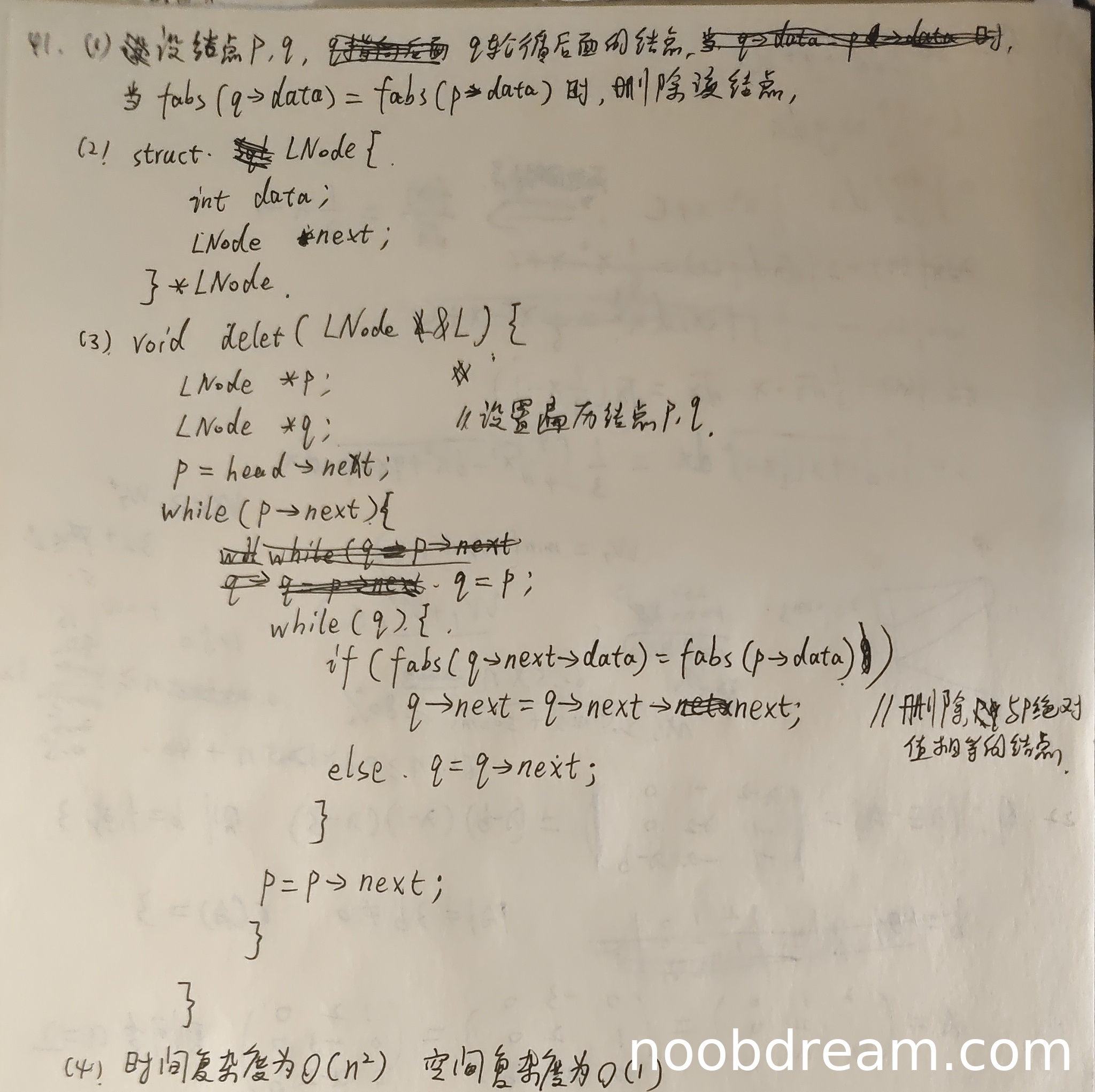 理由:学生对时间复杂度和空间复杂度的分析是正确的。双重循环的时间复杂度确实是O(n²),只使用常数个指针变量的空间复杂度确实是O(1)。这部分分析准确,给满分2分。