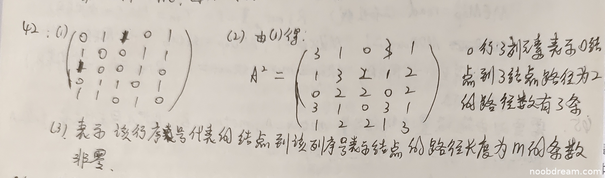 \[ A^{2}=\begin{pmatrix}3&1&0& &1\\1&3&2&1&2\\0&2&2&0&2\\3&1&0&3&1\\1&2&2&1&3\end{pmatrix} \]与标准答案相比,第0行第3列为空白,但根据学生的文字解释“0行3列元素表示0结点到3结点路径为2的路径数有3条”,可知学生认为该位置值为3,与标准答案一致。空白可能是识别错误,判定为误写不扣分。学生对元素含义的解释正确。因此得4分。