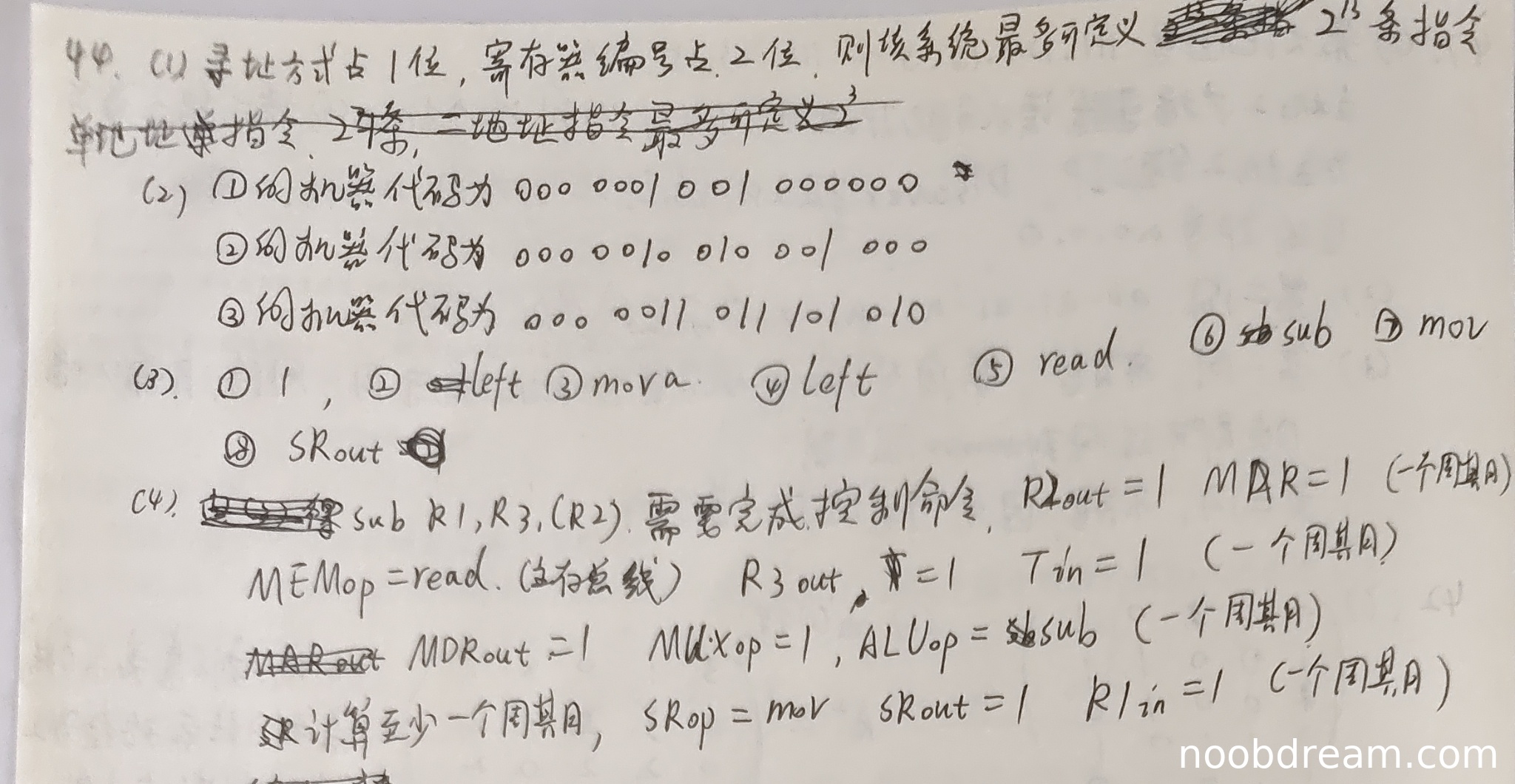学生答案中控制信号部分与标准答案有差异,例如①处学生答“1”而标准答案为“0”,②处学生答“left”而标准答案为“mov”,③处学生答“mora”可能为“mova”的误写(与标准答案一致),④处学生答“left”而标准答案为“left”(一致),⑤处学生答“read”(一致),⑥处学生答“sub”(一致),⑦处学生答“mov”(一致),⑧处学生未在第二次识别中给出,第一次识别为“SRout”可能为“Srout”的误写(一致)。由于多个控制信号错误或缺失,但部分正确,扣2分。