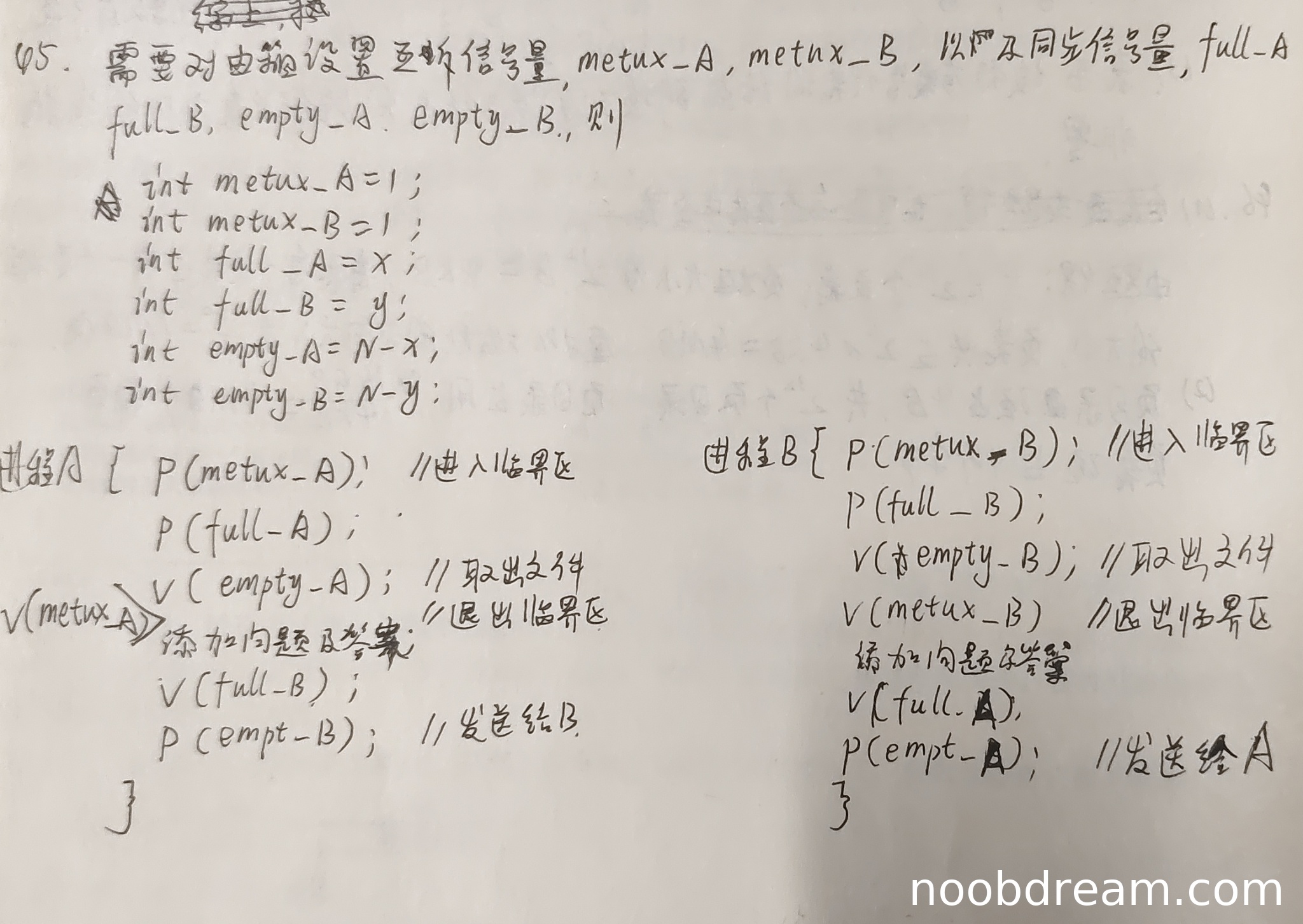 理由:P、V操作顺序存在严重逻辑错误:①取邮件时先P(mutex_A)后P(full_A),可能导致死锁;②取邮件后V(empty_A)顺序正确但缺少V(mutex_A);③放邮件时只有P(empty_B)和V(full_B),缺少对B信箱的互斥保护。同步逻辑基本正确但互斥保护不完整。