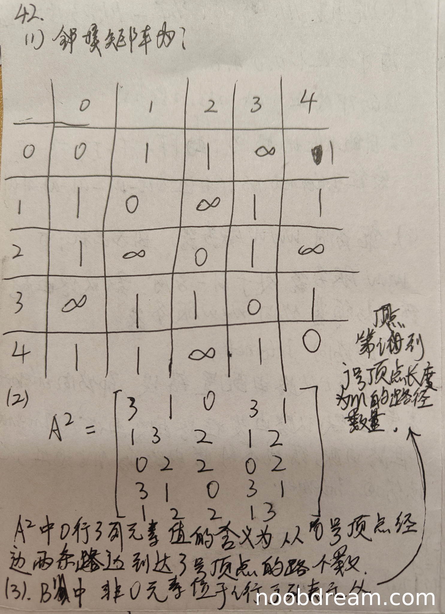 学生正确给出了A²矩阵,且对0行3列元素的含义解释正确(从0号顶点经两条边到达3号顶点的路径数量)。回答完整准确。