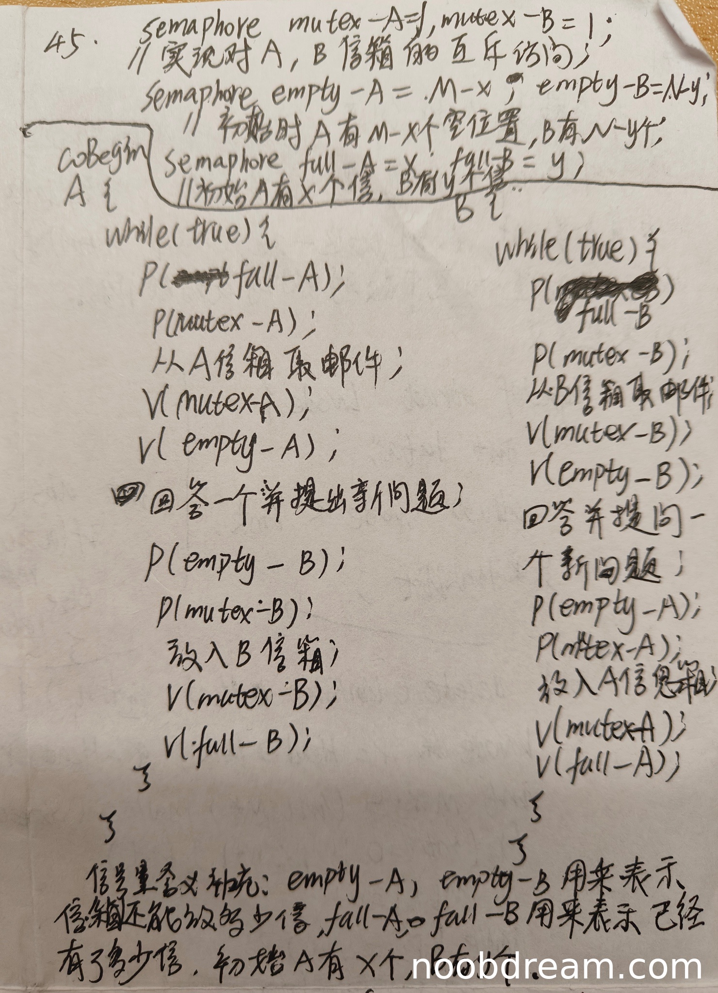 理由:A进程的代码逻辑完全正确。取邮件时先P(full_A)再P(mutex_A),放邮件时先P(empty_B)再P(mutex_B),同步和互斥的顺序都正确。信号量的PV操作配对完整且位置准确。
