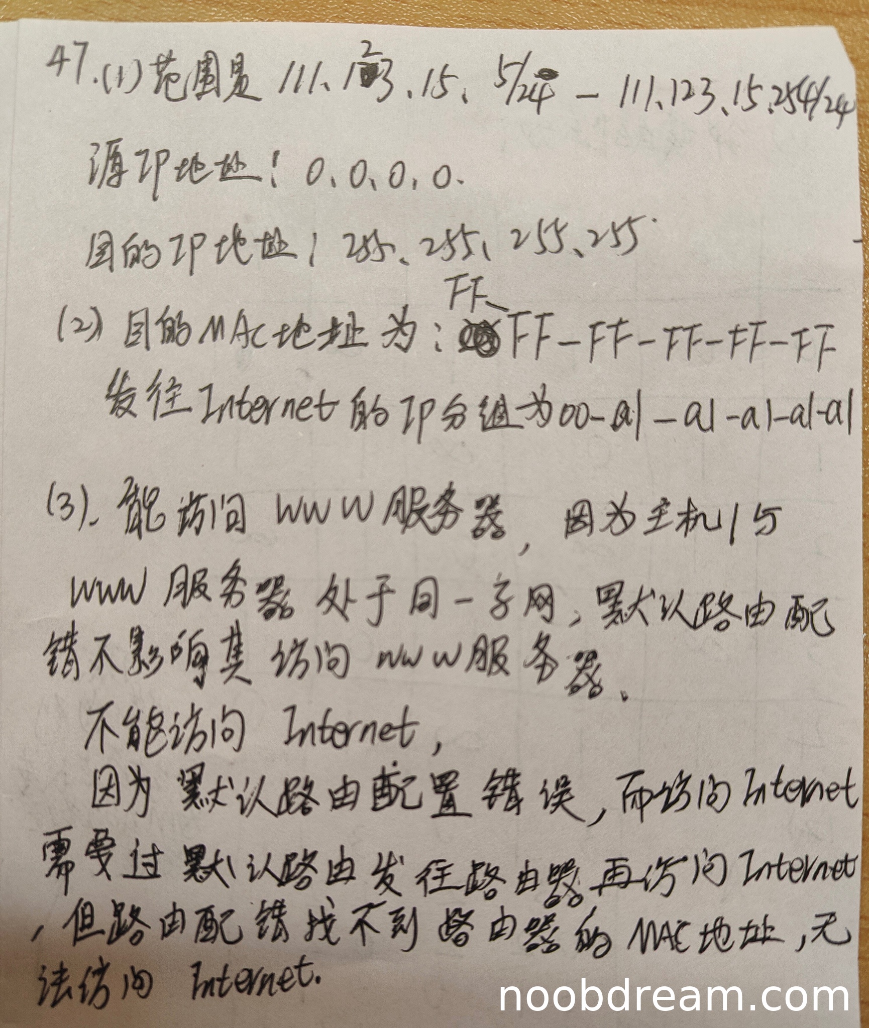 第1次识别结果中,DHCP地址范围写为"111、1/3、15、57/24 - 111、123、15、255/24",存在明显的识别错误和格式问题,但可以看出学生试图表达111.123.15.5-111.123.15.254的范围。根据禁止扣分规则,这种识别错误不扣分。源IP地址和目的IP地址回答正确。第2次识别结果中,地址范围写为"111.133.15.5/24 - 111.123.15.254/24",其中"133"应为"123"的识别错误,根据禁止扣分规则不扣分。源IP和目的IP回答正确。因此本小题得3分。