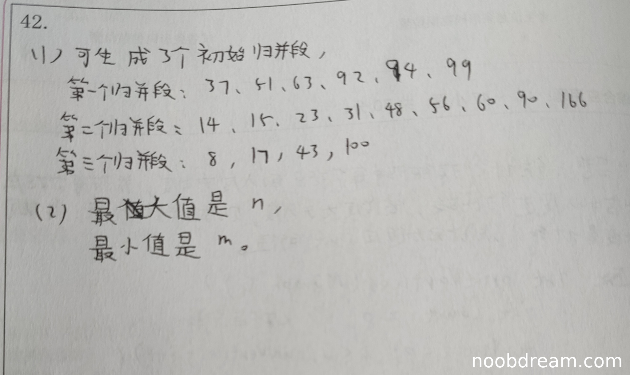 学生正确回答生成了3个初始归并段(得2分),并且三个归并段的内容与标准答案完全一致(每个归并段得2分,共6分)。因此该部分得满分8分。