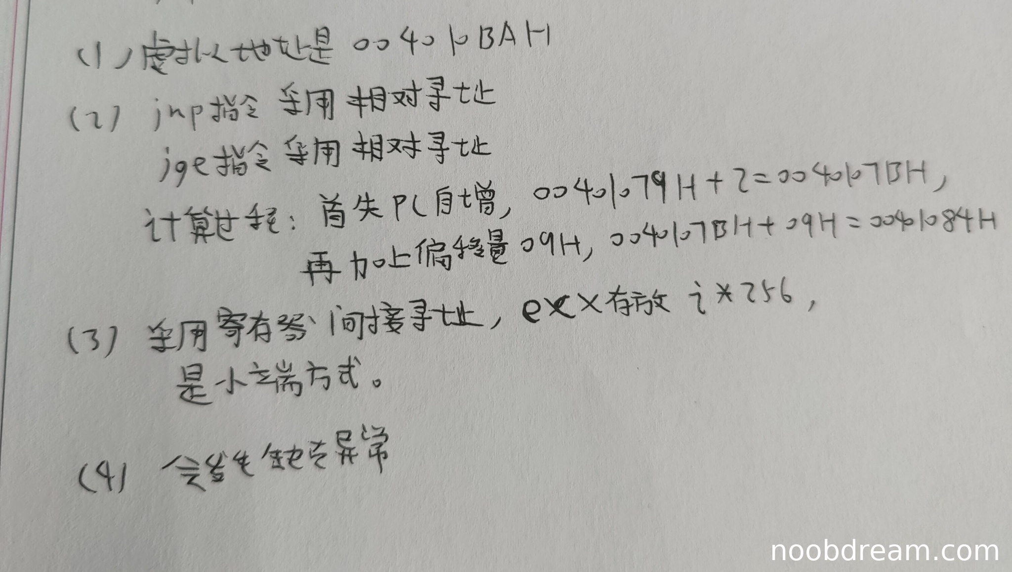 学生正确指出jmp和jge指令均采用相对寻址方式(第一问正确)。对于第二问,学生给出了计算过程:当前指令地址00401079H(识别为0040:079H或0040179H,但根据上下文可判断为误写)加上指令长度2得到下一条指令地址0040107BH,再加上偏移量09H得到目标地址00401084H。计算过程正确,符合相对寻址原理。尽管地址书写有误写,但逻辑正确,因此不扣分。得3分。