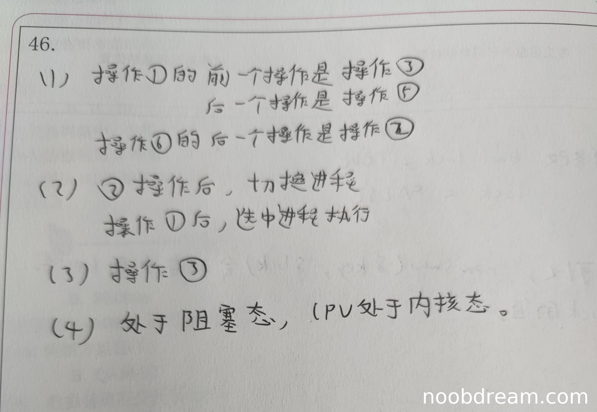 学生回答中,②操作后切换进程、操作①后选中进程执行,这两部分与标准答案一致,得2分。