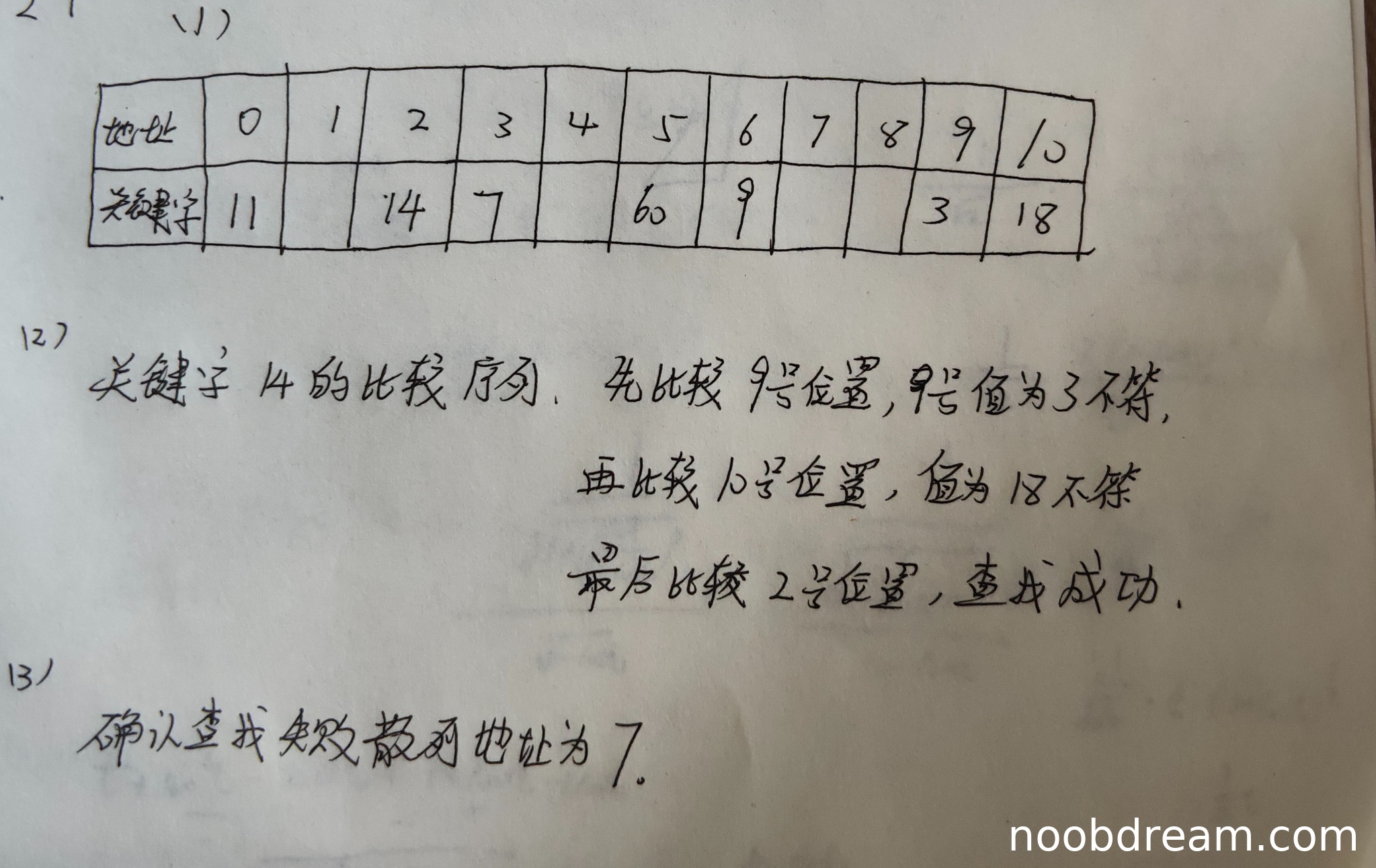 学生直接给出查找失败散列地址为7,与标准答案一致。虽然未展示详细探查过程,但结果正确,因此得满分2分。