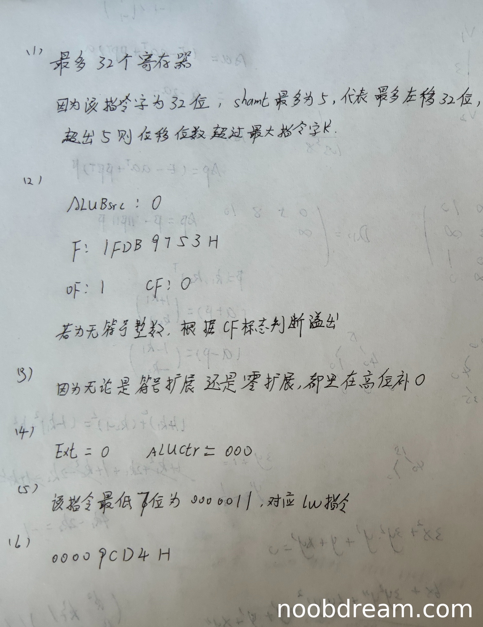 学生回答ALUBsrc=0正确,得1分;F=1FDB9753H正确,得0.5分;OF=1正确,得0.5分;CF=0错误(标准答案为CF=1),扣0.5分;判断无符号整数溢出根据CF标志正确,得0.5分。本题得2.5分。