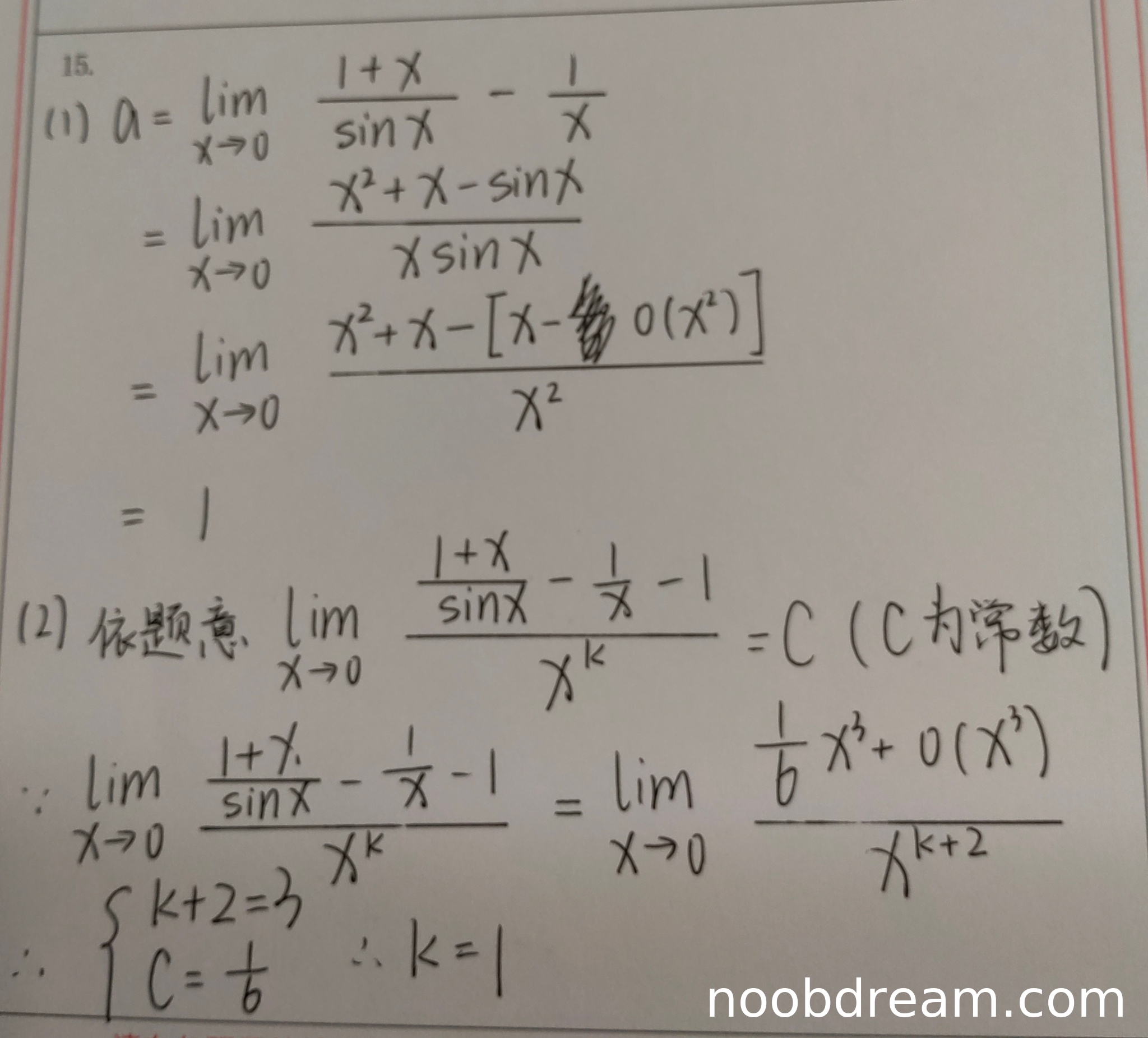 第二问的最终结果正确(k=1),推导过程基本正确。学生正确写出了极限表达式,对分子进行了展开计算,得到了(1/6)x³+o(x³)的结果,并正确建立了k+2=3的方程。虽然中间计算步骤的书写有些混乱,但核心逻辑正确,没有实质性错误。