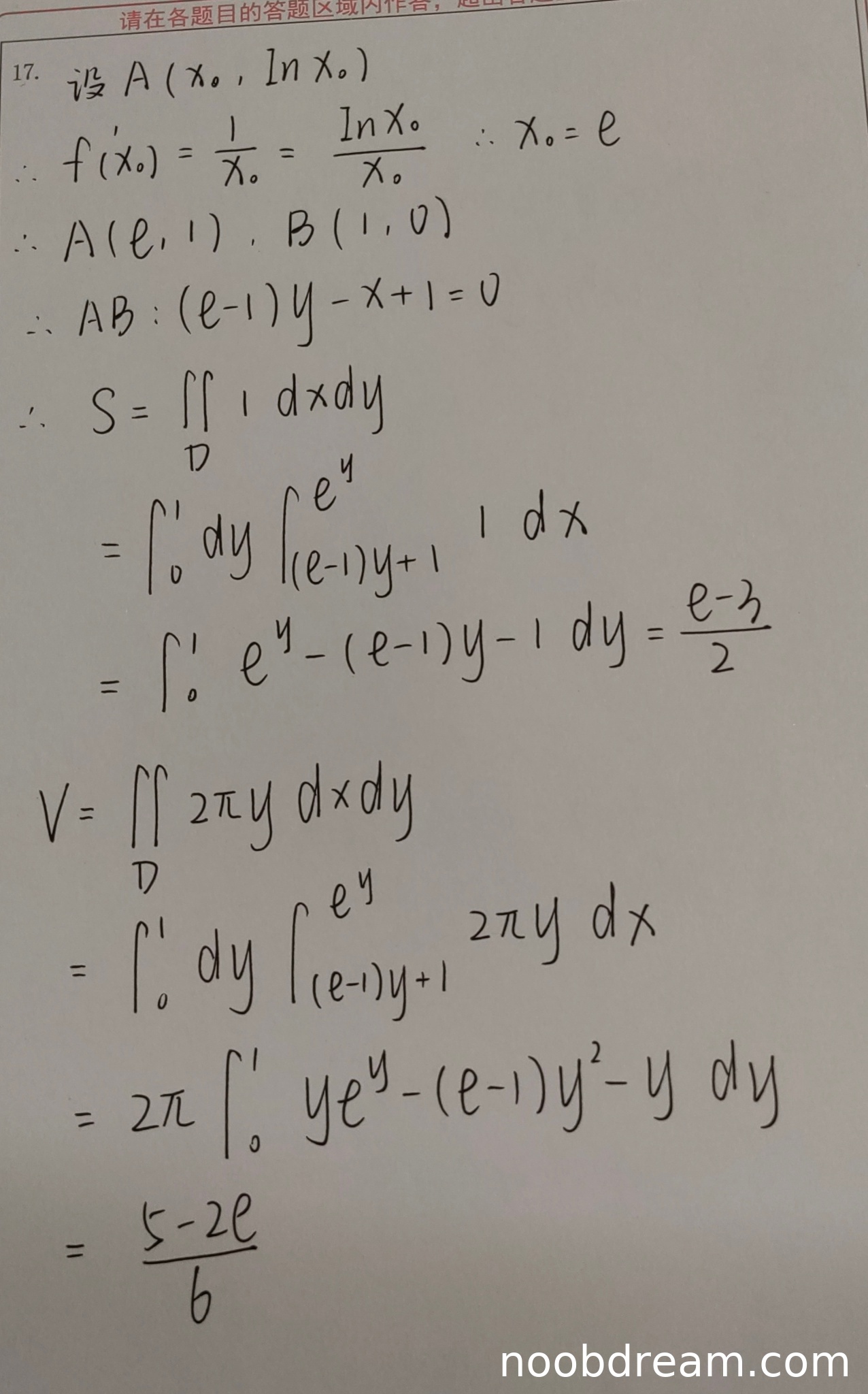 学生计算旋转体体积时,方法正确(使用二重积分计算旋转体体积),但同样因切点坐标错误导致积分区域定义错误。虽然分部积分计算过程无误,但基于错误区域得到的体积结果 \(\frac{5-2e}{6}\) 错误。由于核心逻辑错误,扣3分。得分:2分。