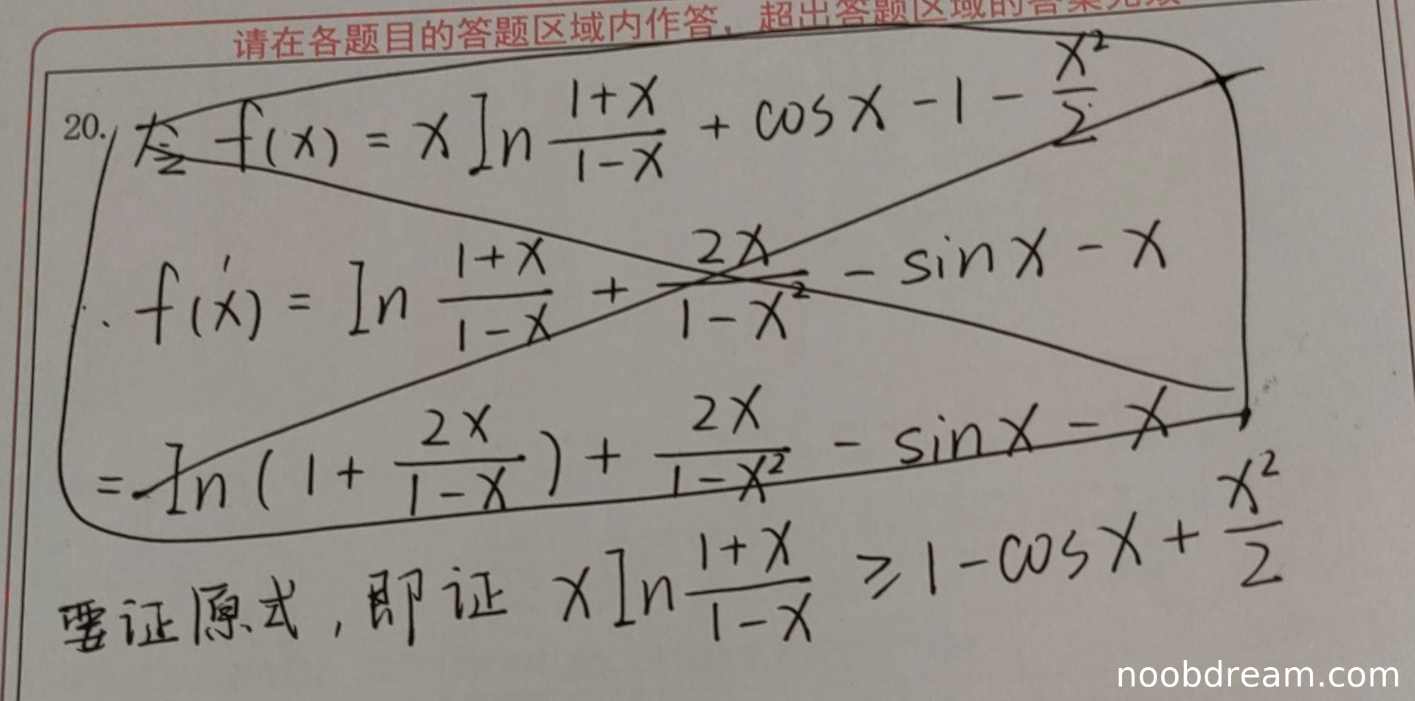 学生作答中定义了正确的函数 \(f(x) = x \ln \frac{1+x}{1-x} + \cos x - 1 - \frac{x^2}{2}\),并计算了一阶导数 \(f'(x) = \ln \frac{1+x}{1-x} + \frac{2x}{1-x^2} - \sin x - x\),这与标准答案的第一步完全一致,思路正确。