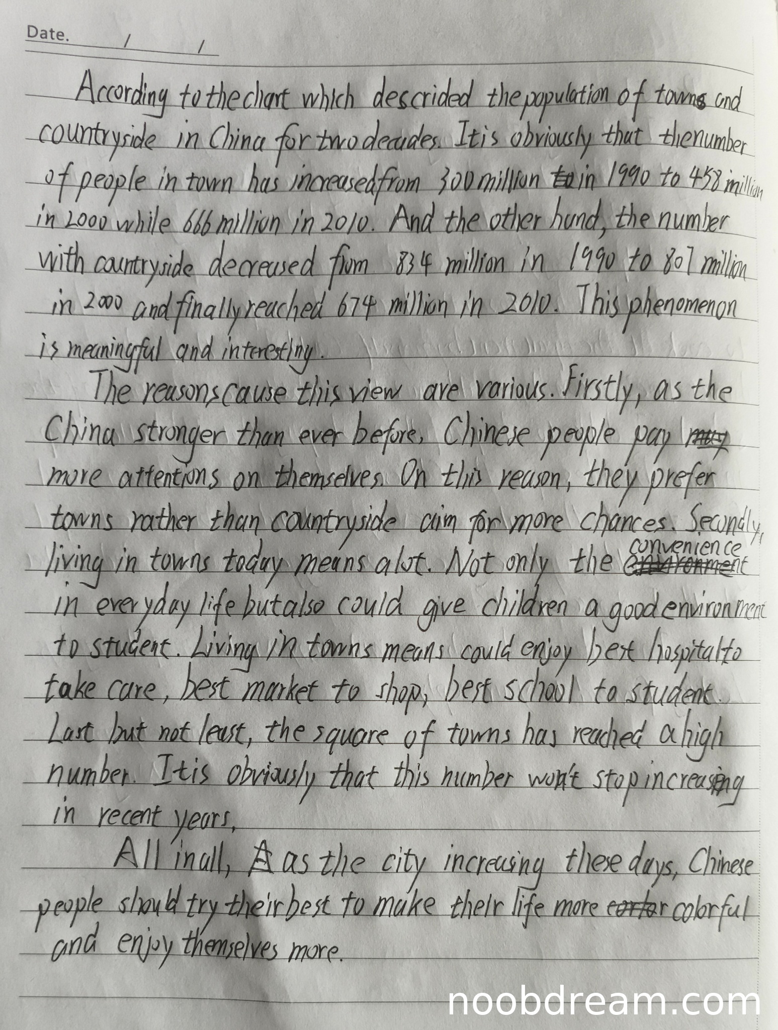 理由:学生较好地完成了图表解读任务,准确描述了城镇人口增长和乡村人口下降的趋势及具体数据。但在评论部分,虽然提供了三个原因(国家发展、城市生活便利性、城市规模扩大),但分析较为表面,缺乏深度,部分表述不够准确(如"the square of towns"应为"the size of cities")。整体包含多数内容要点,但漏掉了一些深度分析。