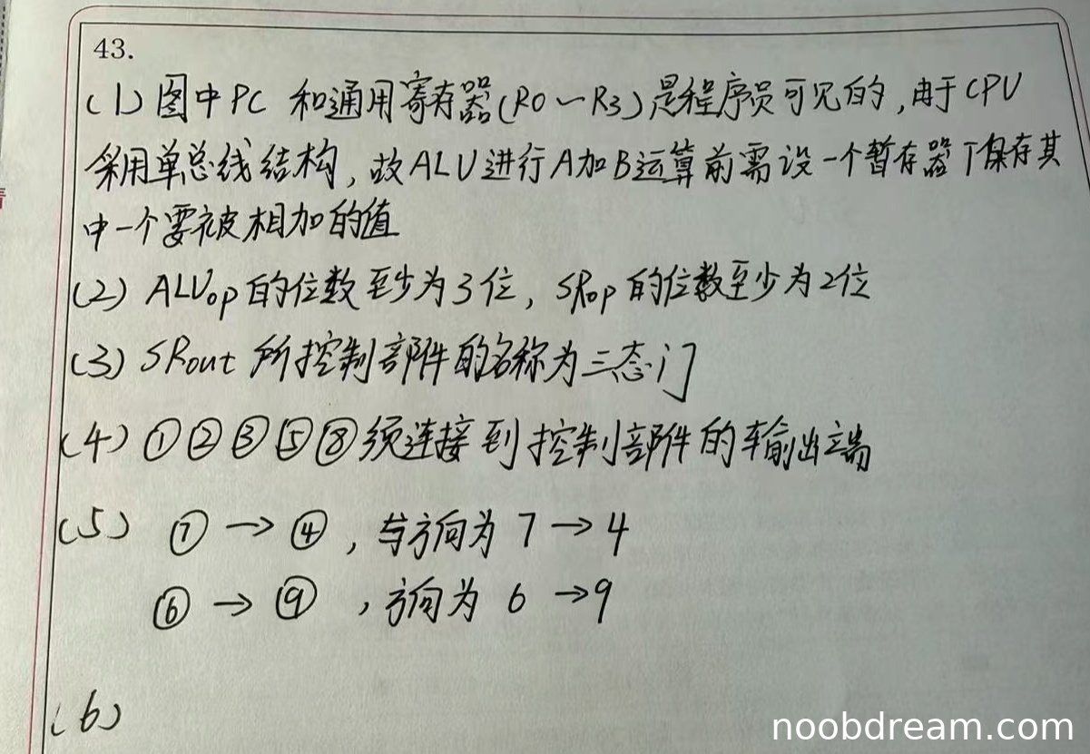 学生答案正确指出ALUop至少3位(7种操作需要3位控制信号),SRop至少2位(3种操作需要2位控制信号),得2分。