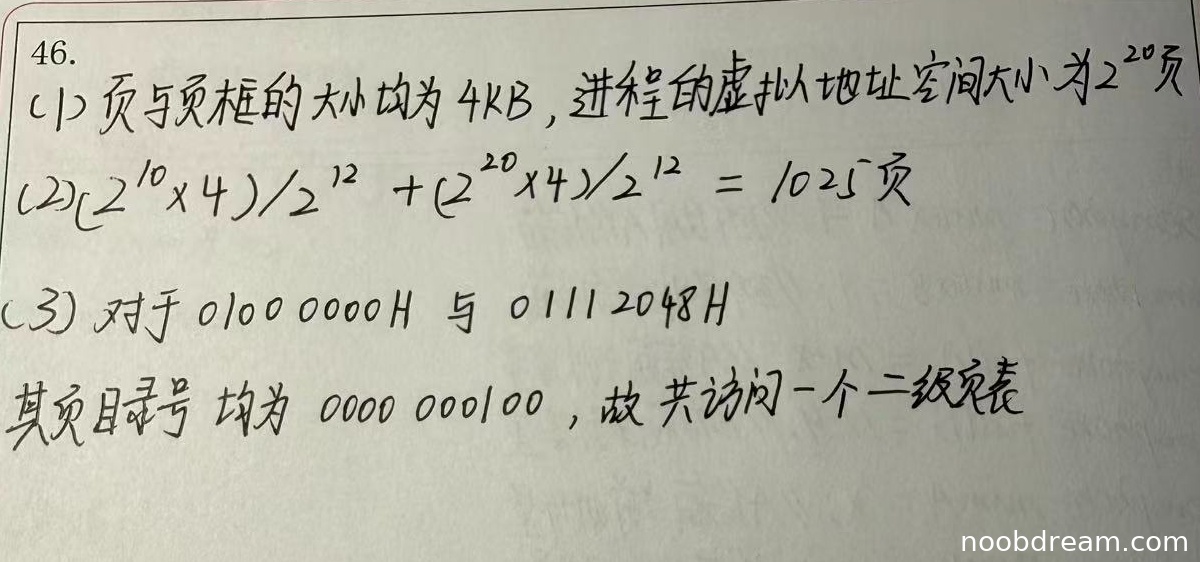 理由:学生正确回答了页和页框大小均为4KB(页内偏移量12位,所以页大小是2^12=4KB),并正确计算出虚拟地址空间大小为2^20页(32位地址空间减去12位偏移量)。答案与标准答案完全一致。