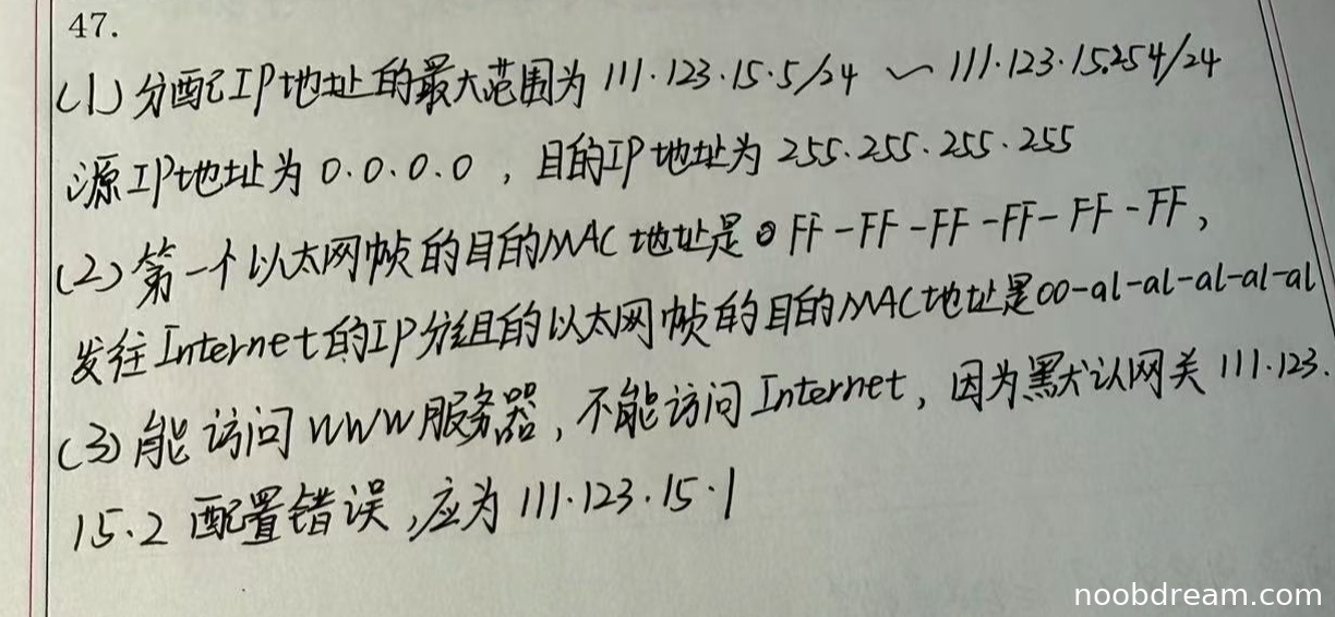 学生答案正确指出了DHCP分配IP地址的范围是111.123.15.5~111.123.15.254,以及DHCP Discover报文的源IP地址为0.0.0.0、目的IP地址为255.255.255.255。虽然学生在范围表示中使用了"/24"的写法(如111.123.15.5/24),但这并不影响核心逻辑的正确性,属于可接受的表达方式。因此,本小题得3分。