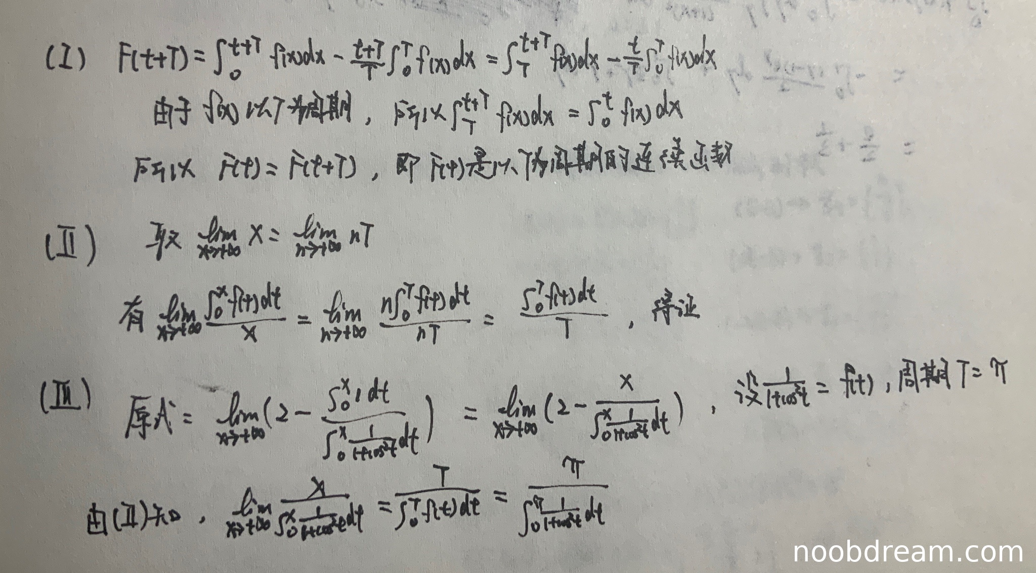 学生取 \( x = nT \) 并计算极限,思路正确,但表达不严谨。标准答案利用(Ⅰ)中构造的 \( F(t) \) 的有界性来推导,而学生直接对周期函数在整数倍周期上取平均,方法可行,结论正确。虽然书写中“取 \(\lim_{x \to +\infty} x = \lim_{n \to \infty} nT\)”表述不当,但核心逻辑正确,不扣分。