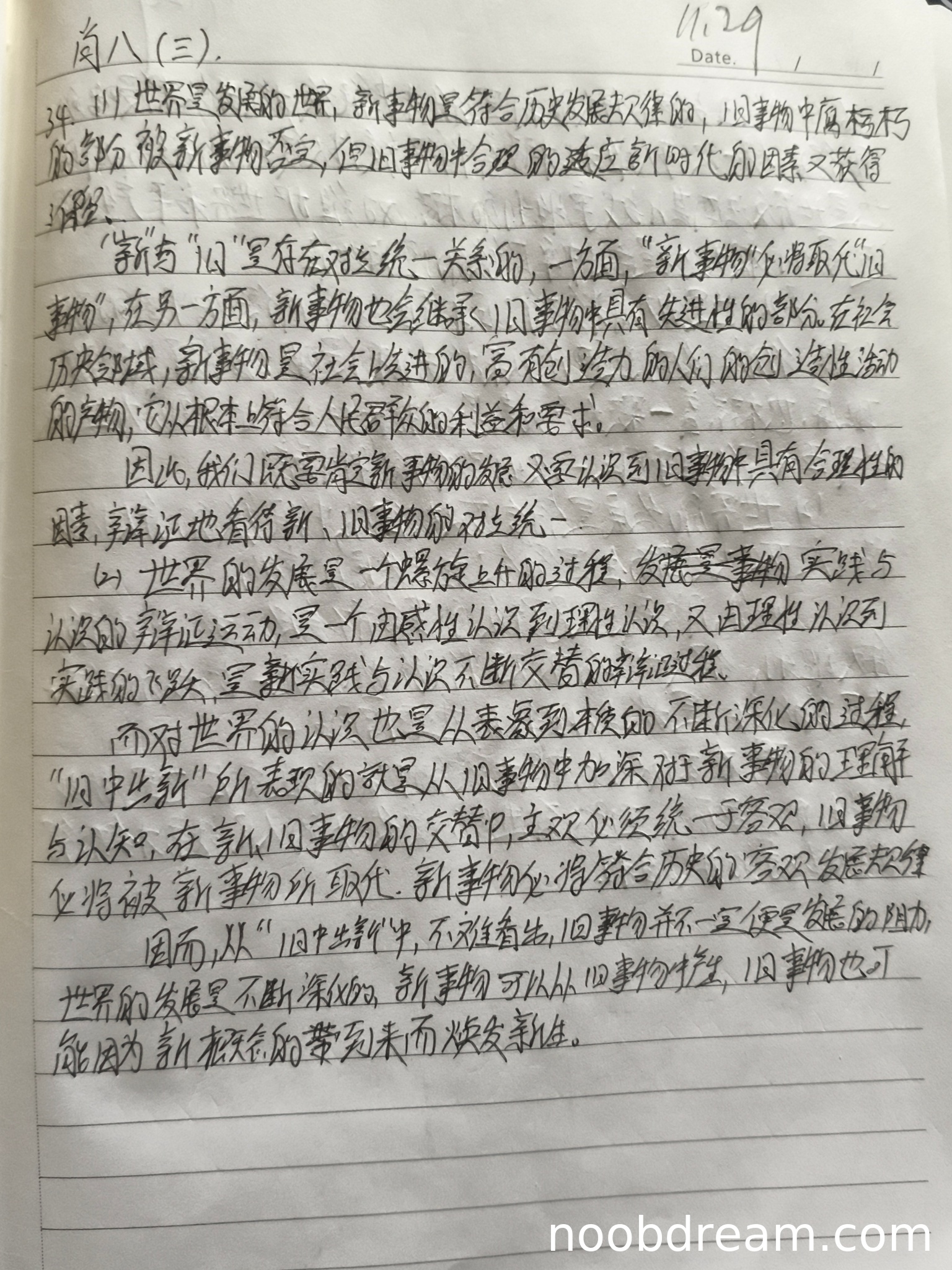 学生答案提到了发展是螺旋上升过程,新事物从旧事物中产生,但未能准确阐述辩证否定原理的核心内容——否定是发展和联系的环节,以及“扬弃”的实质。答案将重点放在认识过程和实践与认识的关系上,偏离了辩证否定原理的要点。因此扣3分,得2分。