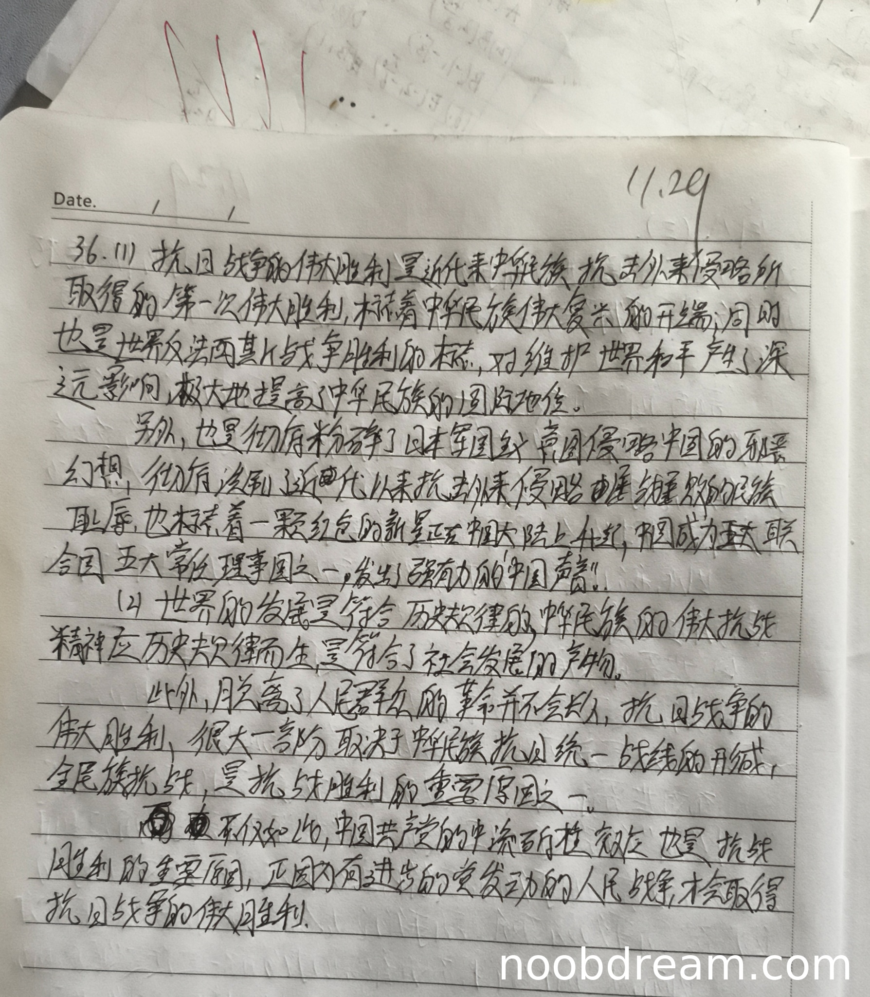 学生答案从历史规律、抗战精神、人民群众作用、抗日民族统一战线、中国共产党领导等角度分析。其中"脱离了人民群众的革命并不会长久"、"全民族抗战"体现了"人民必胜"的思想;"中国共产党的中流砥柱作用"体现了领导核心的重要性。但未直接对应"正义必胜"、"和平必胜"、"人民必胜"三个维度的系统阐述,对"正义必胜"和"和平必胜"的论证较为薄弱,缺乏对和平发展道路、人类发展进步逻辑的深入分析。答案思路正确但不够全面系统。得3分。