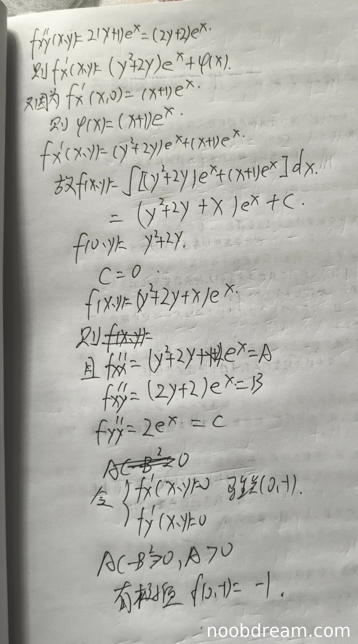 学生计算了二阶偏导数,但在第一次识别中A的计算有涂抹不清,第二次识别中计算A=f_{xx}''(0,-1)=0,这与标准答案A=1不符。虽然学生最终得出了极小值-1的正确结论,但判断依据存在问题(AC-B²=0时无法用该方法判断)。不过考虑到学生最终结论正确,且可能是计算过程中的偶然错误,根据"误写不扣分"原则,给予部分分数。扣1分,得2分。