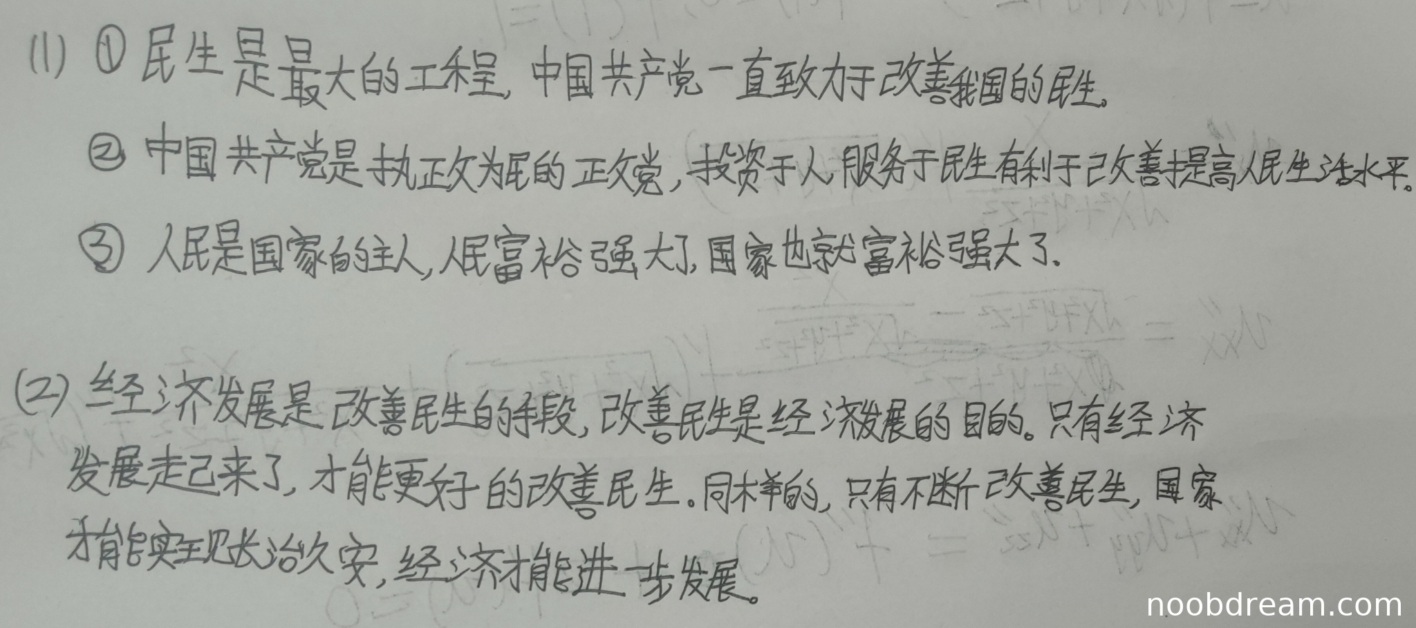学生准确指出了经济发展与改善民生的辩证关系,阐述了"经济发展是改善民生的手段,改善民生是经济发展的目的",这与标准答案中"发展是改善民生的物质基础""民生连着内需、连着发展"的核心观点一致。答案还强调了二者相互促进的关系,思路正确且表述清晰。给5分。