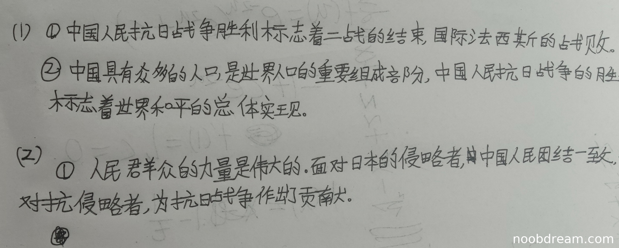 学生两次识别结果都只强调了"人民群众的力量是伟大的",这对应了标准答案中"人民必胜"的部分内容,但完全没有涉及"正义必胜"和"和平必胜"这两个重要方面。根据标准答案,需要从正义必胜、和平必胜、人民必胜三个维度全面阐述历史启迪。学生答案内容单一,不够完整,给2分。
