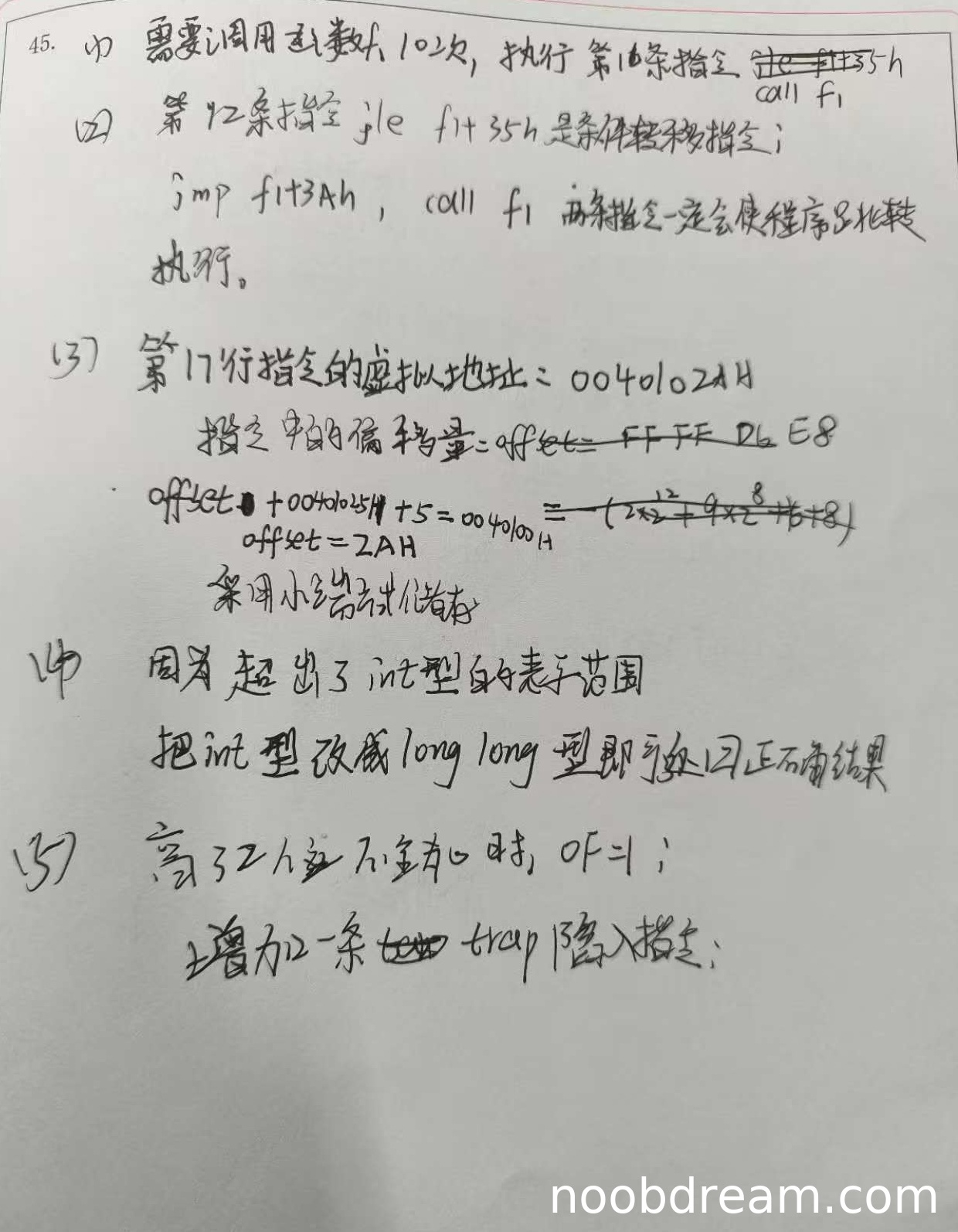 学生第一问回答“高32位不全为0时,OF=1”不准确,应为高33位非全0且非全1;第二问回答“trap陷入指令”基本正确。第一问扣2分,第二问得2分。本小题得2分。