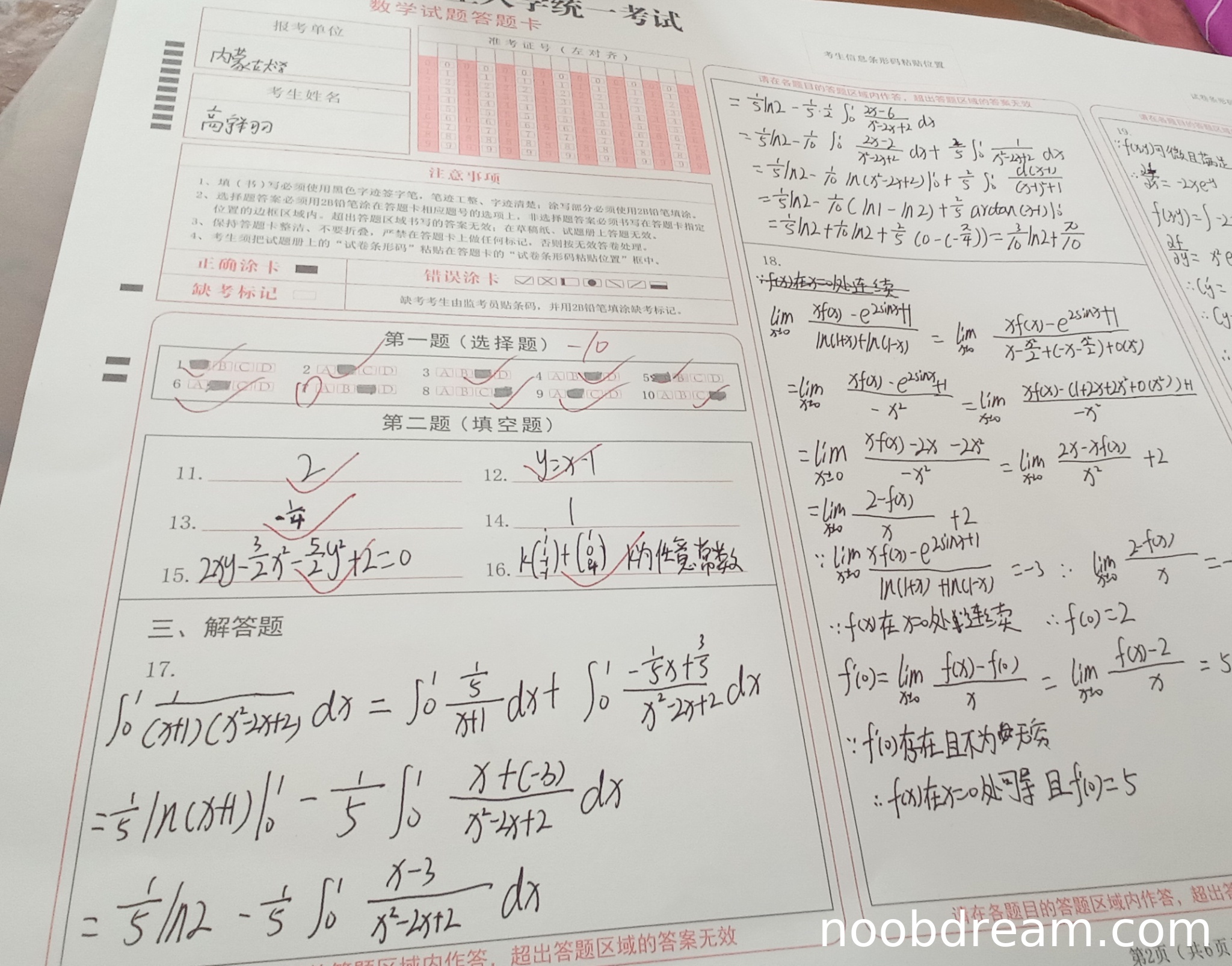 第18题是求极限和导数问题,但题目要求只评判第17题(定积分计算),因此本题不计分。