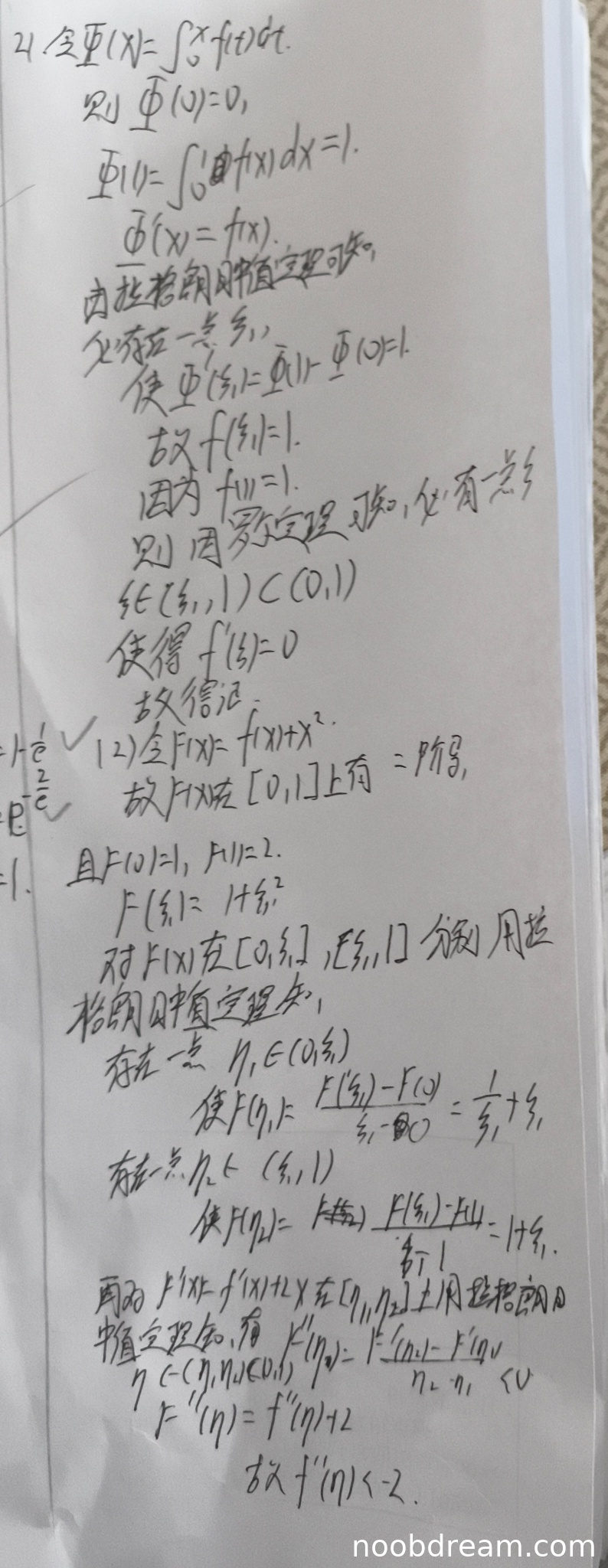 最后得到F''(η)<0,即f''(η)+2<0,所以f''(η)<-2。证明思路正确,逻辑完整。