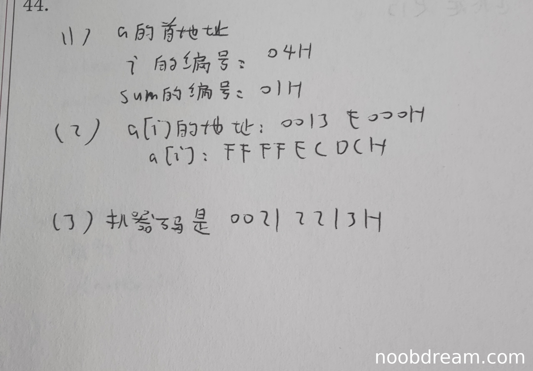学生答案中,数组a的首地址寄存器编号未给出,变量i的寄存器编号为04H(应为02H),sum的寄存器编号为01H(正确)。根据标准答案,数组a的首地址、变量i和sum的寄存器编号分别为03H、02H和01H。学生答案中i的寄存器编号错误,且缺少数组a的首地址寄存器编号,因此扣2分。得分:1分。