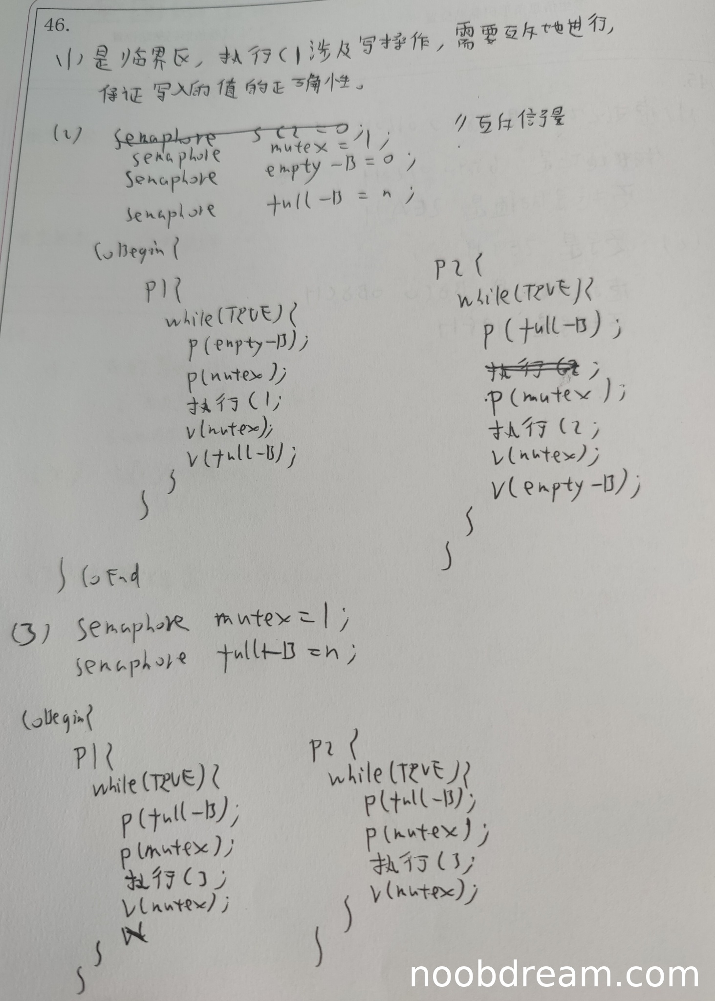 学生使用了mutex和full-B两个信号量,但题目要求"尽可能少的信号量"。标准答案只需要mutex一个信号量。学生额外定义了full-B且初值设为n不合理(应为1)。信号量定义过多且初值错误,但互斥逻辑正确。扣1分。得2分。