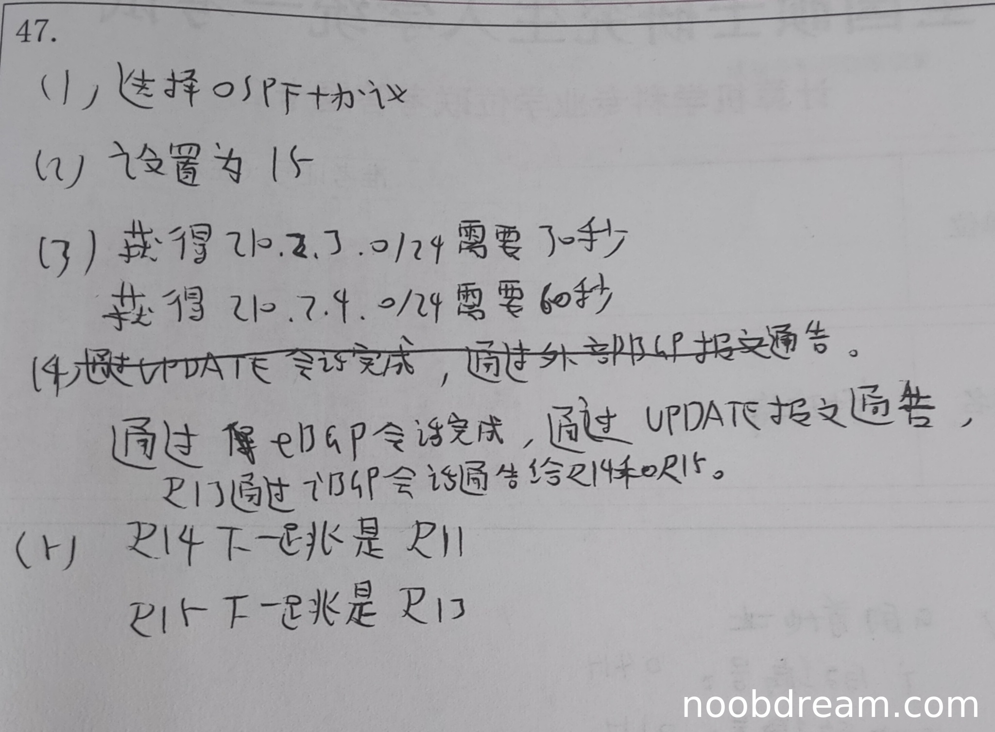 学生两次识别结果均选择OSPF协议,与标准答案一致。虽然第一次识别结果中写为"OSPF+",但根据上下文判断应为"OSPF"的误写,不影响核心逻辑。因此得1分。