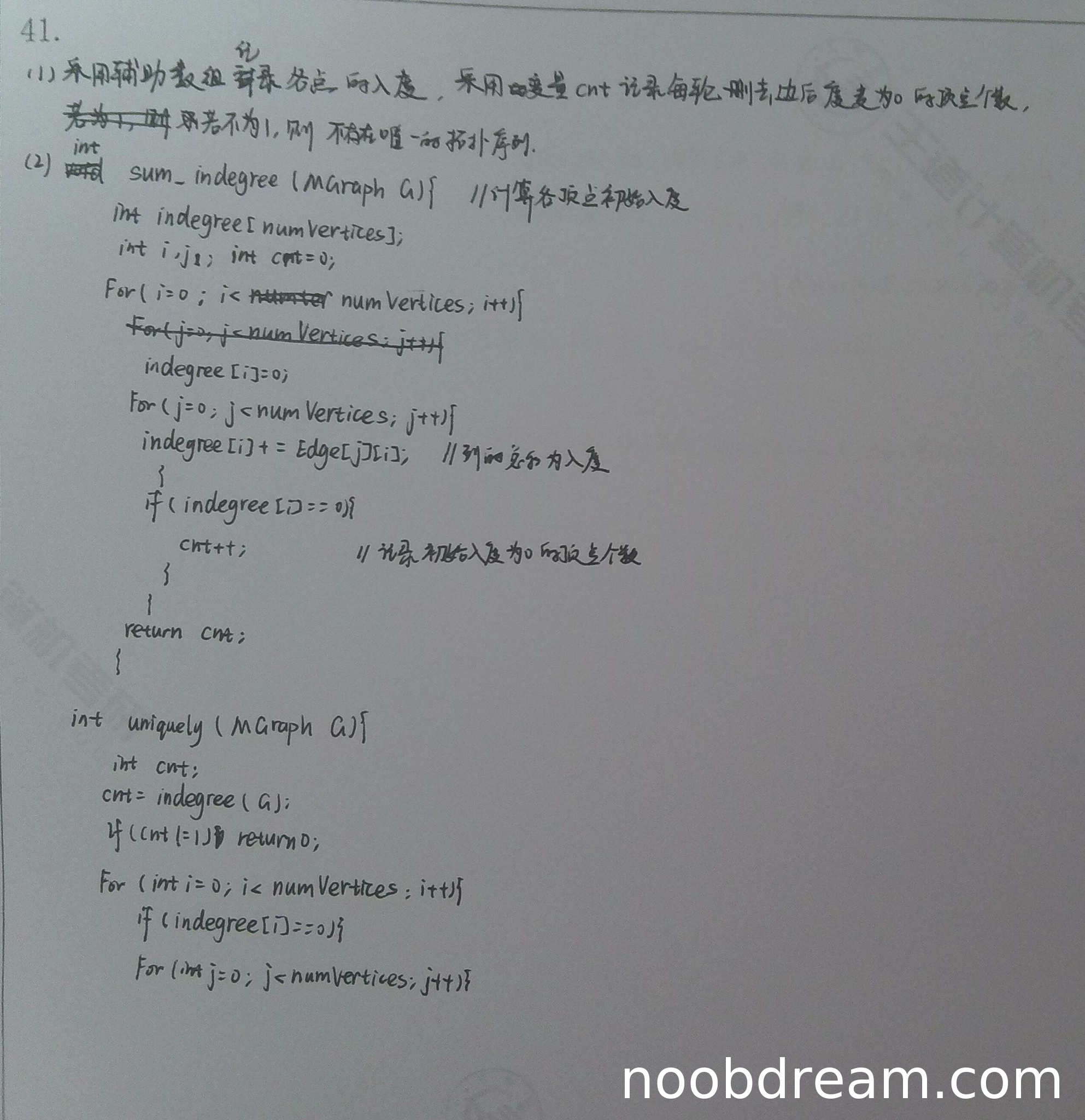 - 代码中存在语法错误:在uniquely函数中使用了未定义的变量numVertices和indegree(-1分)