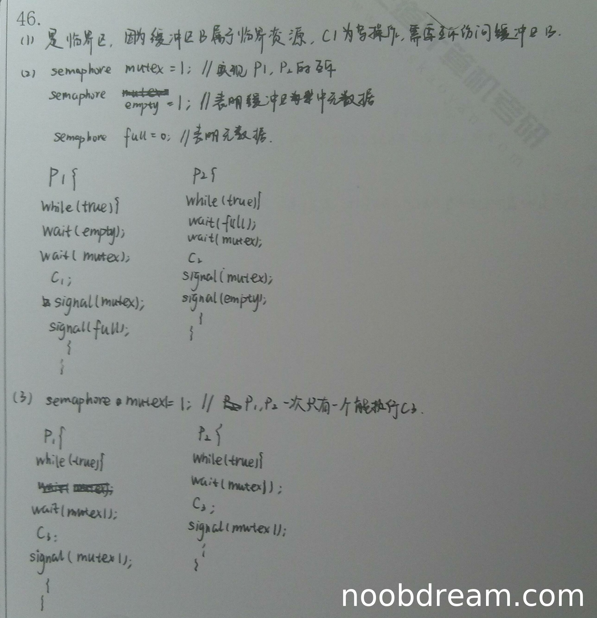 学生正确使用了一个信号量mutex1来实现互斥,代码逻辑正确,与标准答案一致。虽然信号量命名为mutex1而非mutex,但这不影响理解。得3分。