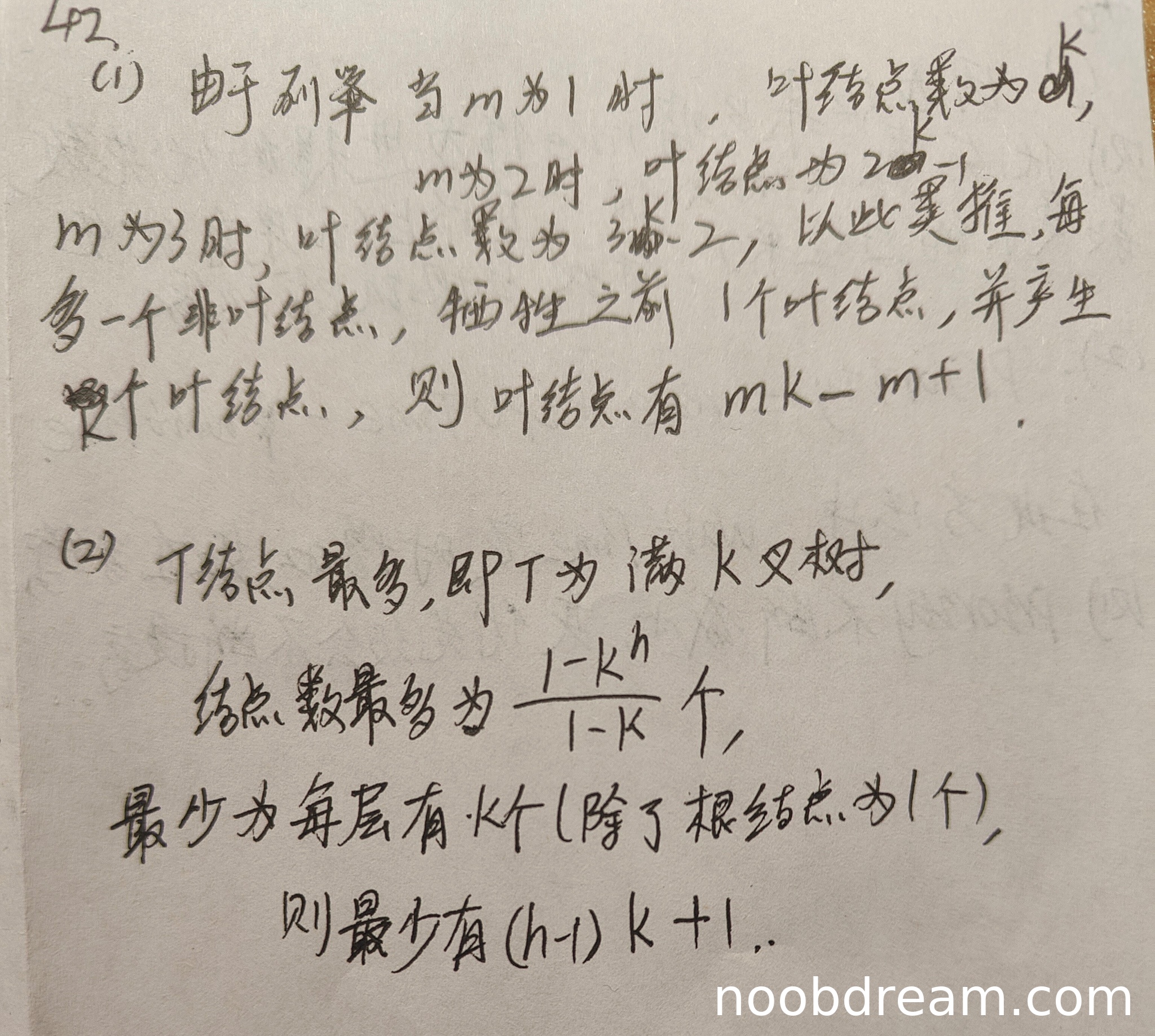 学生通过列举m=1,2,3等特殊情况,归纳出叶结点数为mk - m + 1,这与标准答案n₀=(k-1)m+1等价(展开后相同)。推导过程虽然与标准答案不同,但思路正确且结论正确。根据评分说明,思路正确不扣分,因此得3分。