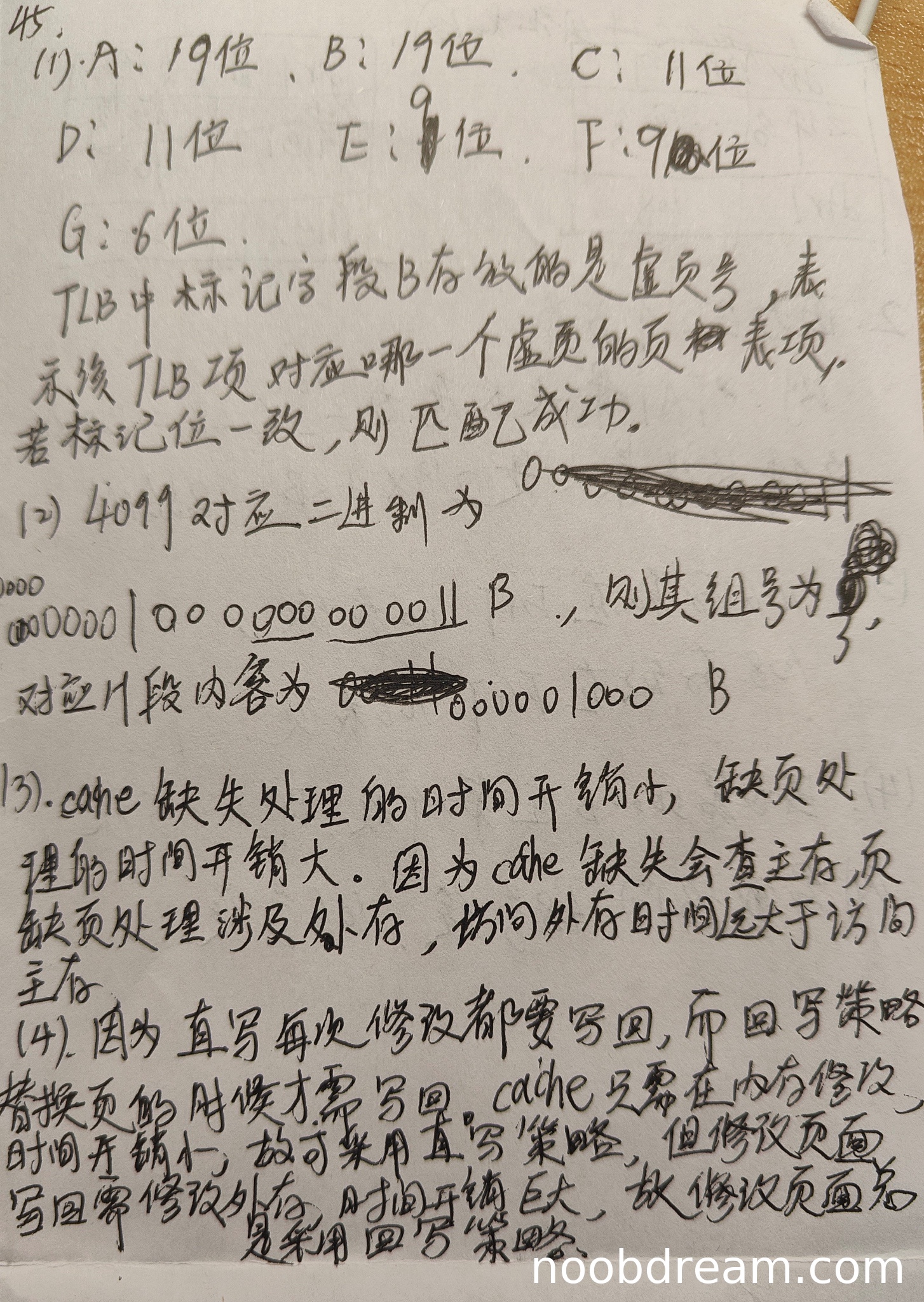 学生答案中A、B、C、F、G的位数正确,但D的位数错误(应为13位,学生答11位),E的位数在第一次识别中缺失,第二次识别中正确(9位)。TLB标记字段B的解释正确。因此,A、B、C、E、F、G各1分,共6分;TLB标记字段解释正确得1分;D错误扣1分。本小题得7分。