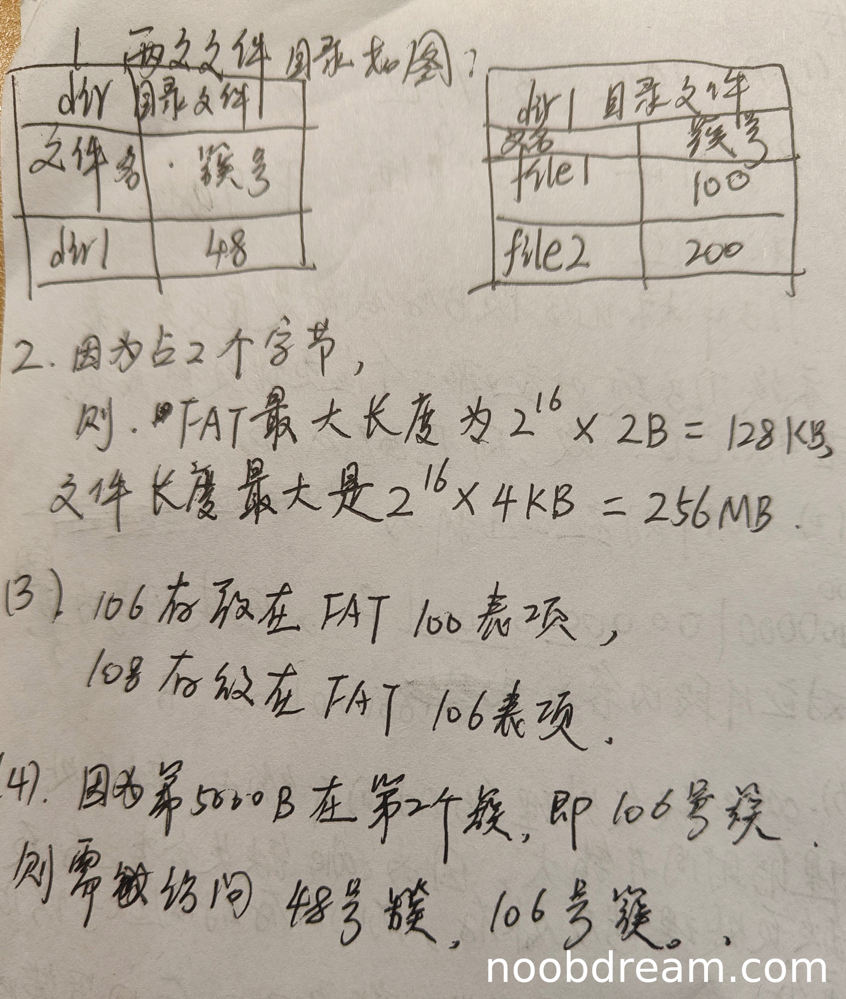 学生正确指出需要访问48号簇(dir1目录文件)和106号簇(file1的第2个簇),与标准答案一致。因此得2分。